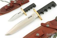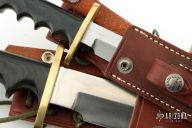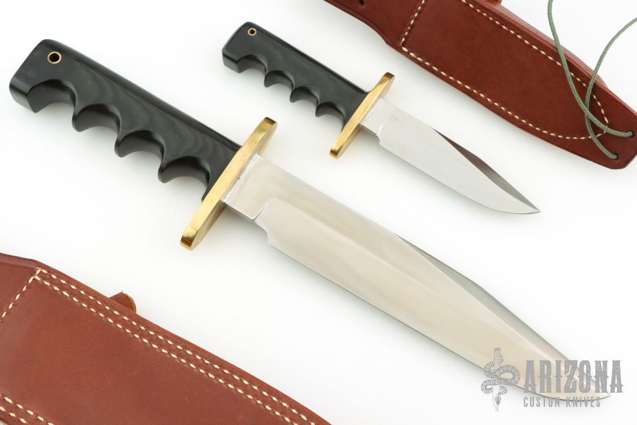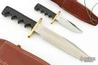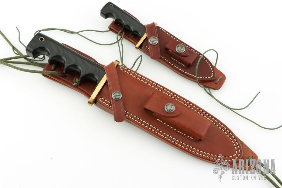 This Model 14-7.5 Attack by Randall Made Knives features a satin finished clip point blade with sharpened top edge, .233" blade stock and 1.388" blade depth, full tang construction. The handle is comprised of a brass double guard and black linen micarta grip. Brass lanyard tube with lanyard in pommel. Includes brown leather sheath with belt loop and sharpening stone. Excellent condition. Comes with matching Miniature Model 14. Both are #169.