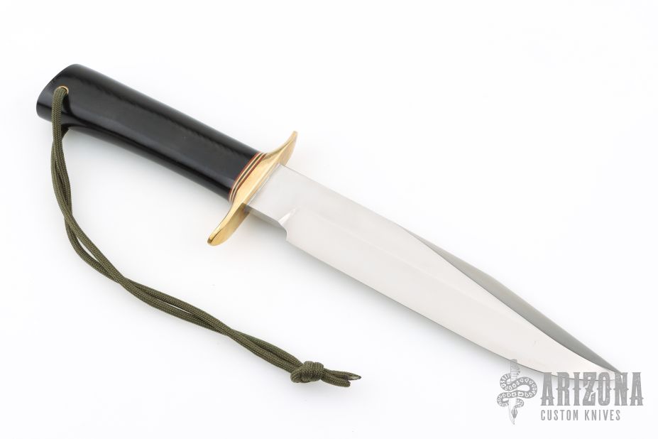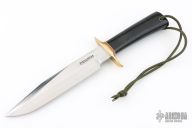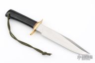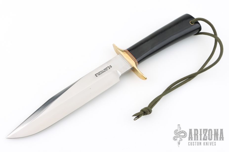 This Model 1-7 from Randall Made Knives features a satin finished clip point blade with sharpened top edge, .235" blade stock and 1.395" blade depth, hidden tang construction. The handle is comprised of a brass guard, red/white/blue spacers, black linen micarta handle with lanyard hole in pommel. Has a couple light scuffs, excellent condition otherwise.