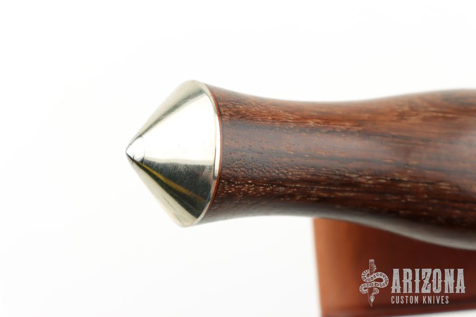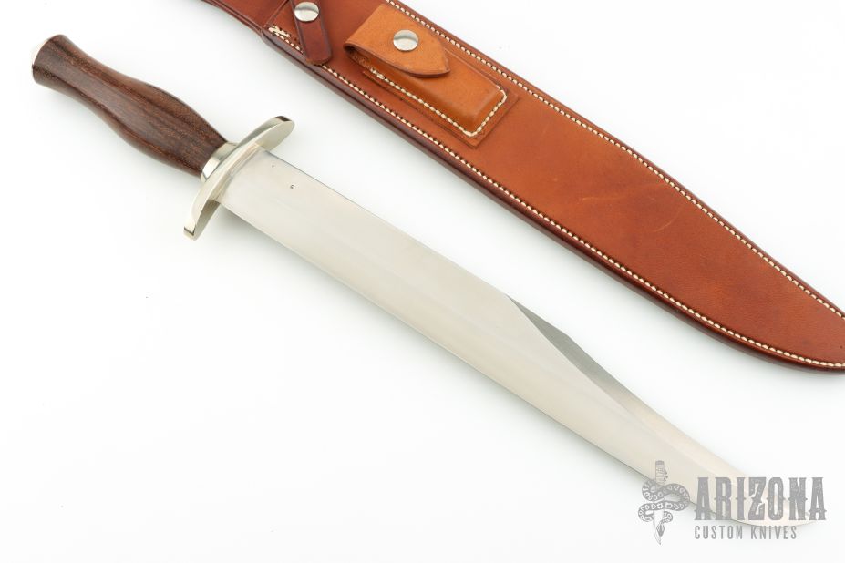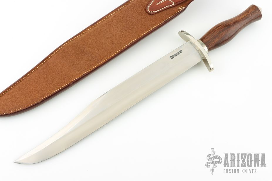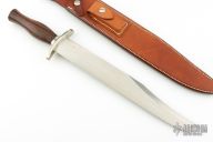 The 13" Randall Thorp Bowie by Randall Made Knives has a 13" carbon steel blade with sharpened top edge, .213" blade stock and 1.677" blade depth, hidden tang construction. The handle has a forward curved nickel silver guard, collar and coolie capbutt, wood grip. Comes with a brown leather sheath. Has a "G" on the b-side of the blade. Has a couple light scratches, otherwise excellent condition.