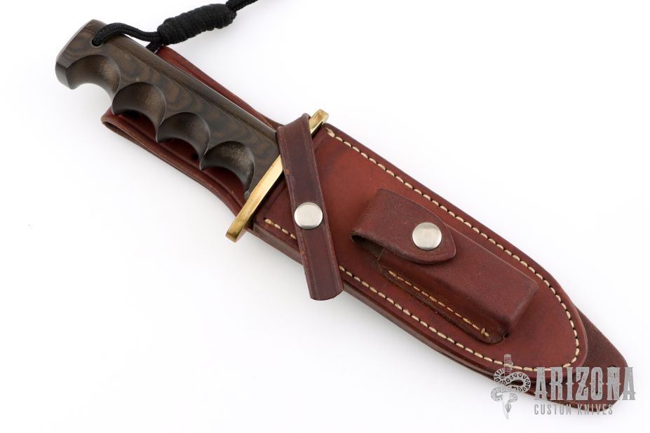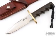 This Model 15 Airman by Randall Made Knives features a clip point blade with a sharpened top edge, .223" blade stock. 1.241" blade depth, full tang construction. The handle has black linen micarta handle with finger grips and a brass guard. The Model 15 is designed especially for heavy-duty use and to be as nearly indestructible as possible. Comes with a Sullivans brown leather sheath. Has some light scratches, excellent condition.