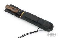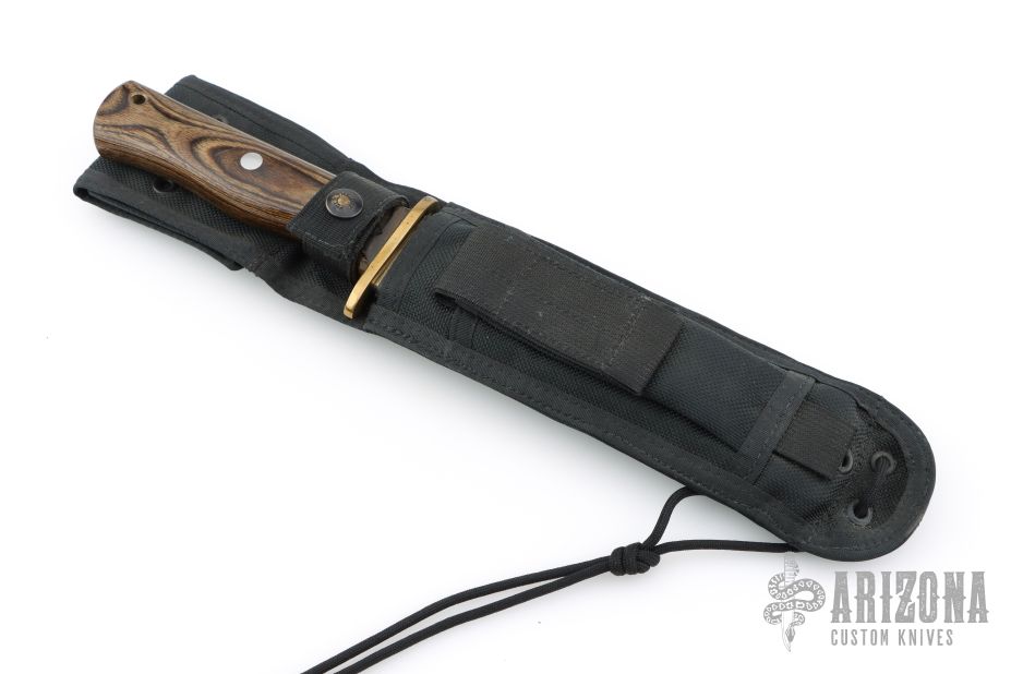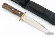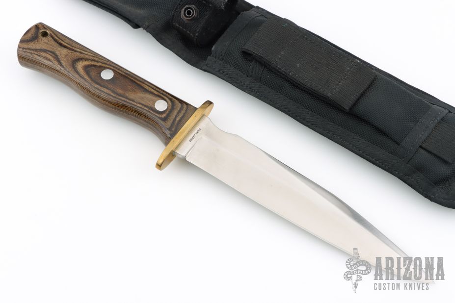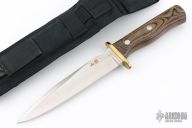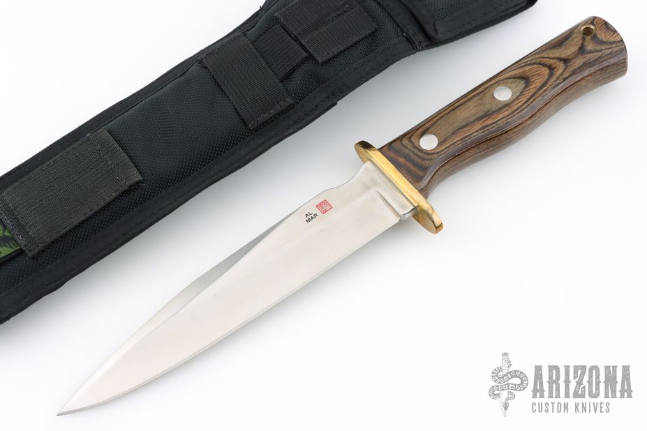 This Fighter by Al Mar features a satin finished blade with false top edge, .233" blade stock and 1.409" blade depth, hidden tang construction. The handle has a brass guard and laminated wood handle with stainless steel pins. Comes with a black nylon sheath. Has some light scratches, otherwise Excellent condition.