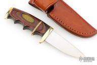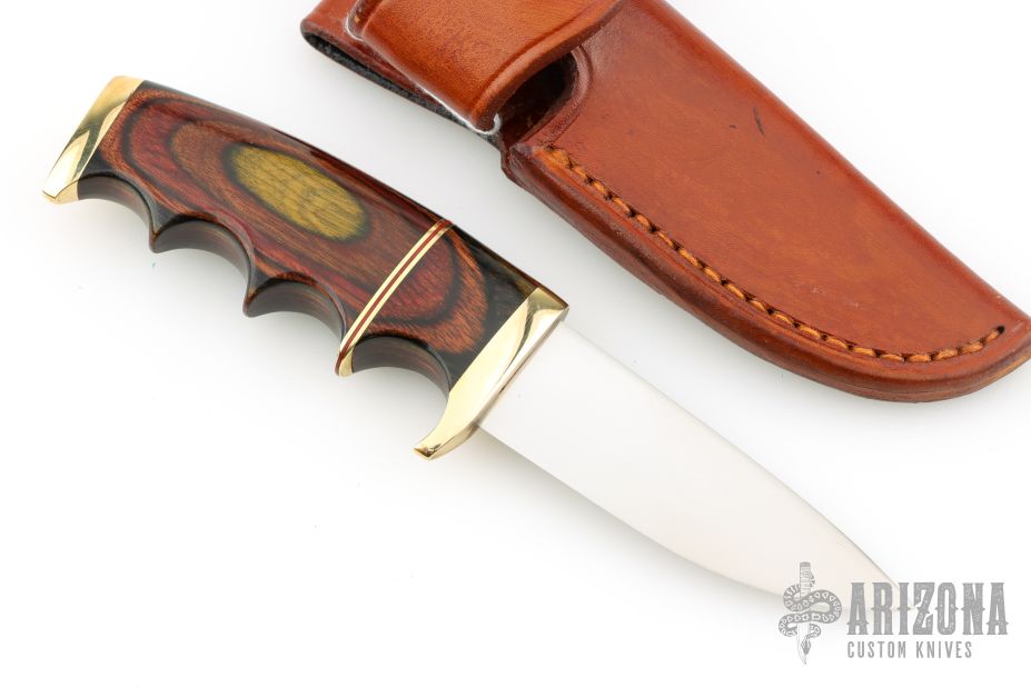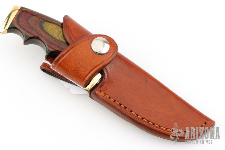 This Finger Grip Hunter by Walter Stockdale features a hand rub satin finished drop point blade with convex edge, .092" blade stock and 1.025" blade depth, hidden tang construction. The handle has a brass guard and butt, pakkawood grip with brass/red spacers. Includes leather sheath with belt loop. Excellent condition.