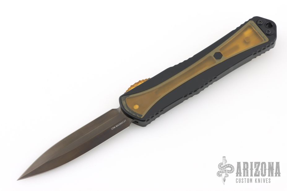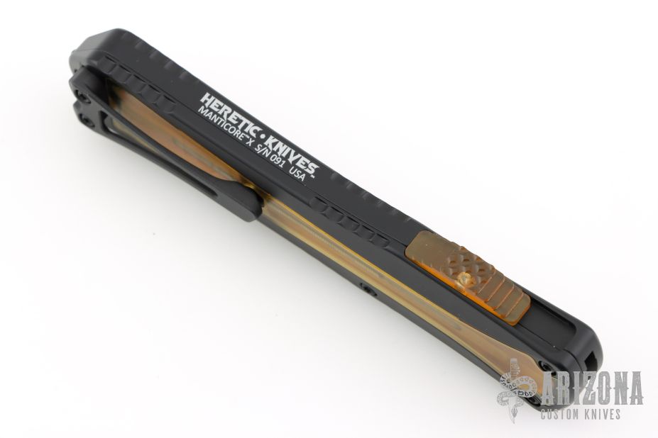 This Manticore-X by Heretic Knives features a DLC stonewashed double-edged blade. The handle has a black aluminum frame with ultem inlays, black stainless steel hardware, tip down clip, and thumb slide. Comes with original box, lube and papers. S/N 091. Excellent Condition.