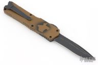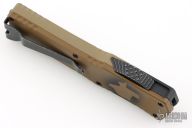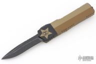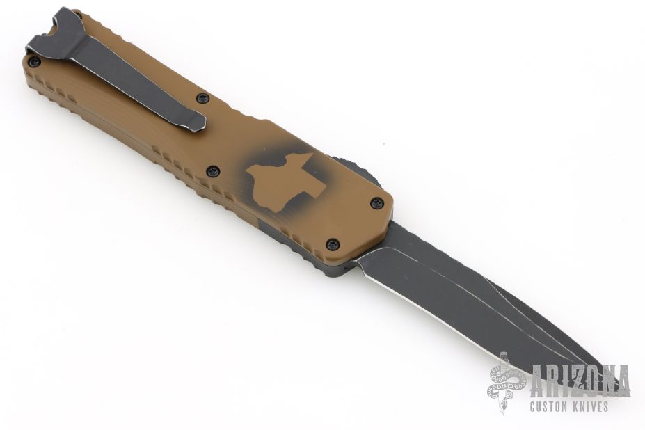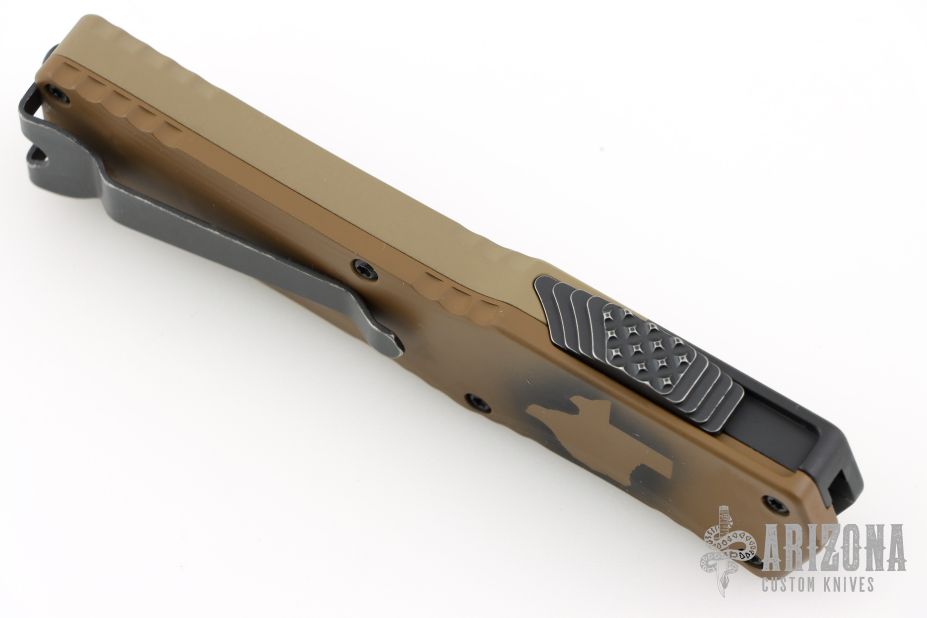 This Colossus by Heretic Knives features a battle black recurve blade with notched thumbrest.  The handle has a Lone Star Flag finished aluminum frame with black battleworn tip down clip. Ball Bearing Glassbreaker. Comes with original box, papers and OTF lube. Excellent condition.