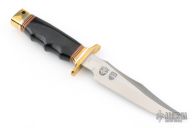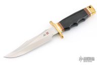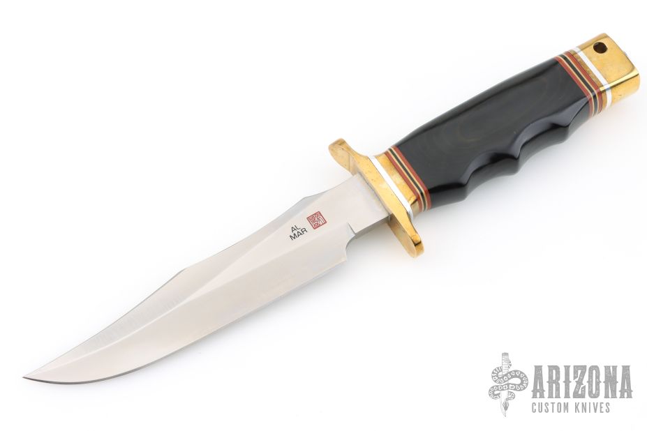 This SF-SOG Bowie by Al Mar Knives features a satin finished blade with a sharpened top edge, .232" blade stock and 1.398" blade depth, hidden tang construction. The handle has a brass guard/pommel and black paper micarta handle with aluminum, brass, red, white and black spacers. Has a few light scratches, otherwise excellent condition.