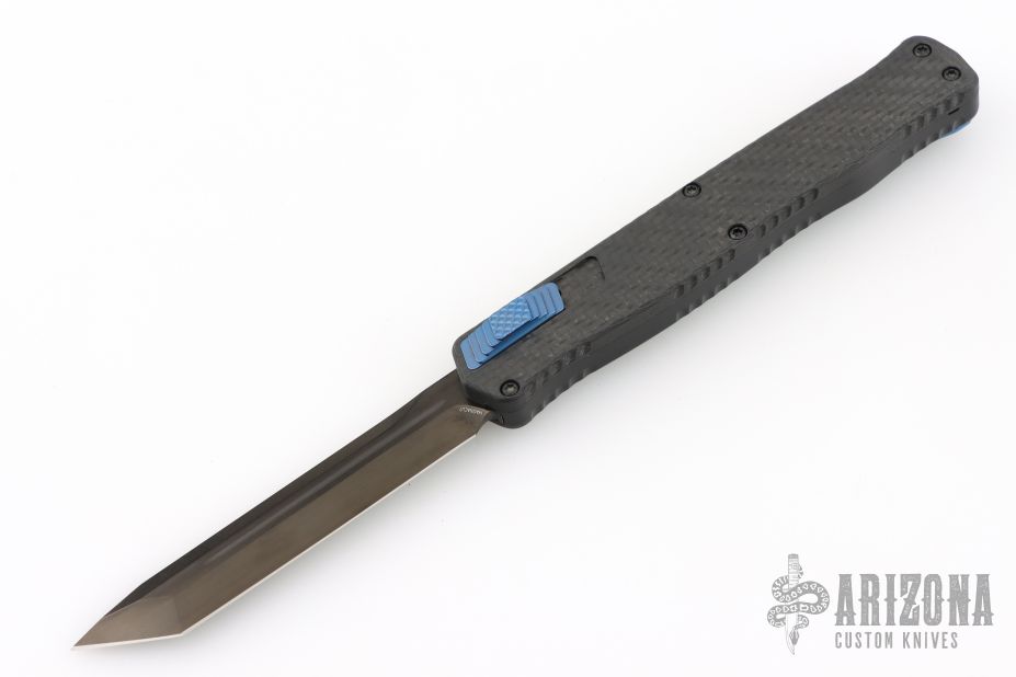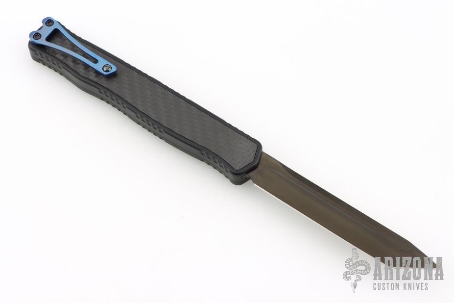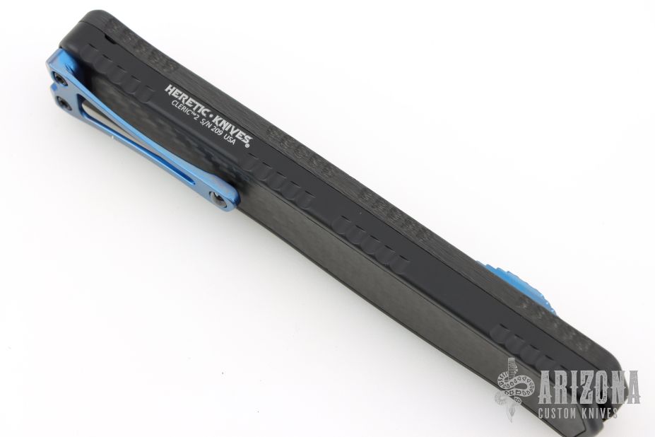 This Cleric II OTF by Heretic Knives features a DLC stonewashed tanto Magnacut blade with false top edge and fullers. The handle has a black aluminum frame with carbon fiber inlays, blue titanium accents and tip down clip with ceramic ball. Comes with box, lube and papers. Excellent condition.  #209