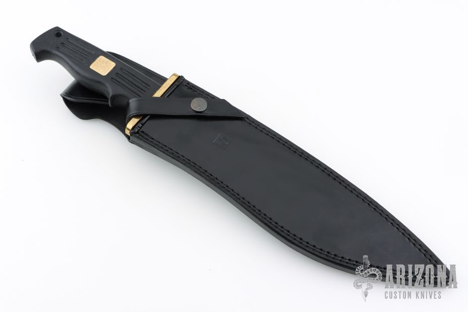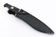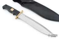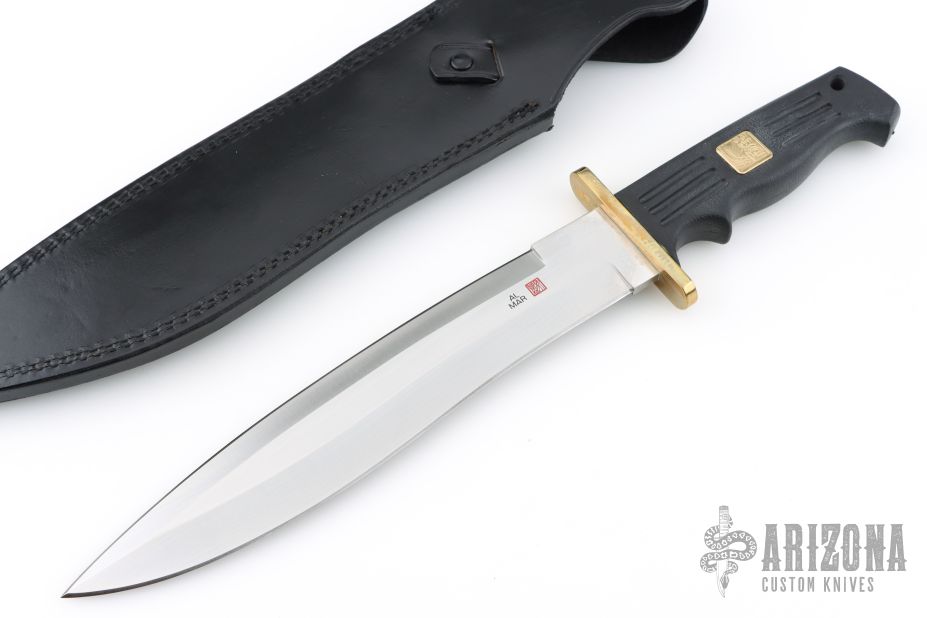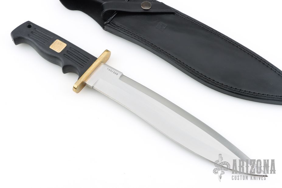 This Quest III by Al Mar features a satin finished recurve blade with sharpened top edge, .228" blade stock and 1.727" blade depth, hidden tang construction. The handle has a brass guard and black rubber grip. Comes with original box, papers, and leather belt sheath. Has some light spots, excellent condition. #145/200