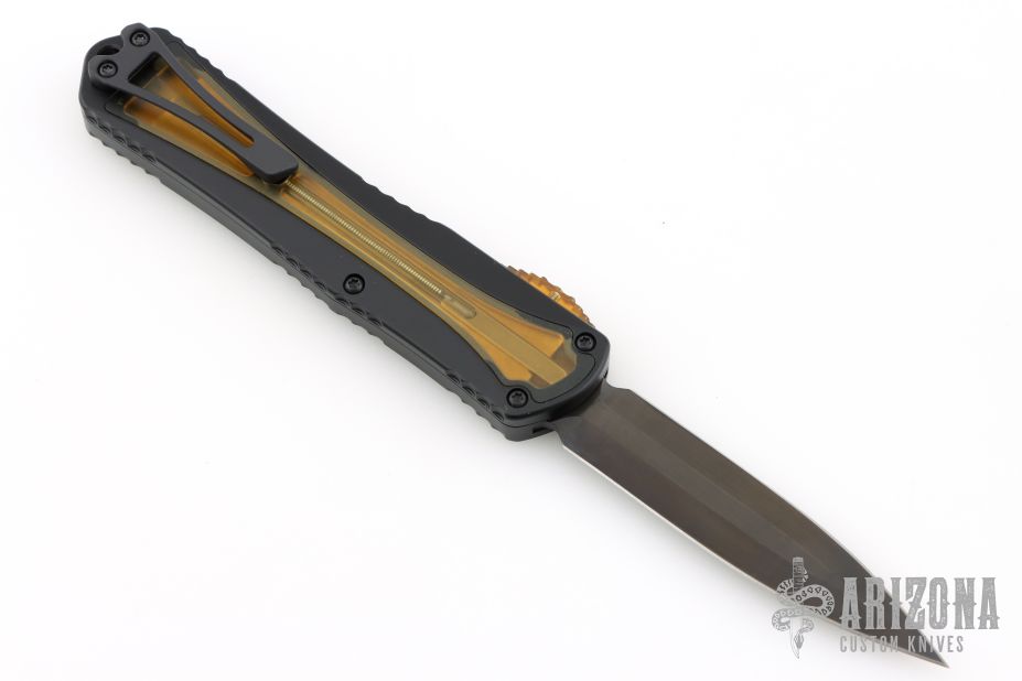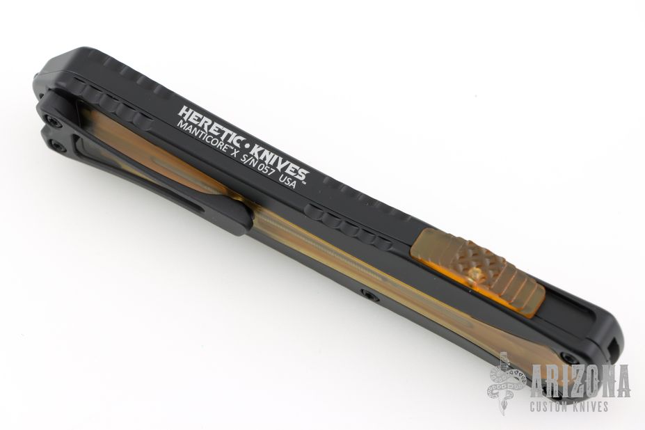 This Manticore-X by Heretic Knives features a DLC stonewashed double-edged blade. The handle has a black aluminum frame with ultem inlays, black stainless steel hardware, tip down clip, and thumb slide. Comes with original box, lube and papers. S/N 057. Excellent Condition.
