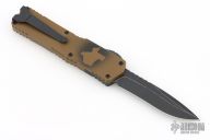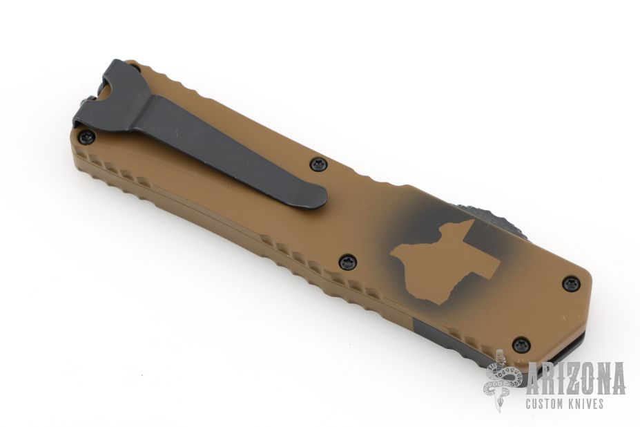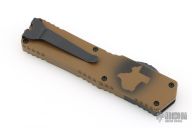 This Colossus by Heretic Knives features a battle black recurve blade with notched thumbrest.  The handle has a Lone Star Flag finished aluminum frame with black battleworn tip down clip. Ball Bearing Glassbreaker. Comes with original box, papers and OTF lube. Excellent condition.
