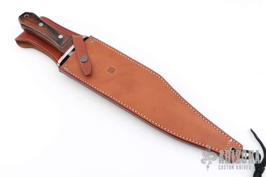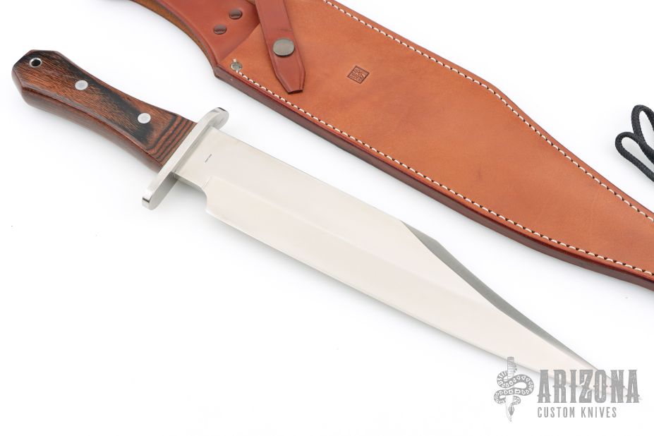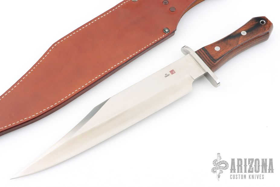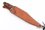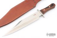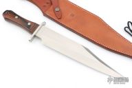 This Alaskan Bowie by Al Mar features a satin finished clip point blade with a false top edge, .225" blade stock and 2.100" blade depth, full tang construction. The handle has a stainless steel guard, and wood scales. Comes with a brown leather sheath and original box. Has some very light scratches, otherwise excellent condition.