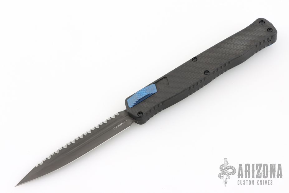 This Cleric II OTF by Heretic Knives features a DLC double edged Magnacut blade with a full serrated edge and fullers. The handle has a black aluminum frame with carbon fiber inlays, blue titanium accents and tip down clip with ceramic ball. Comes with box, lube and papers. Excellent condition.  #557