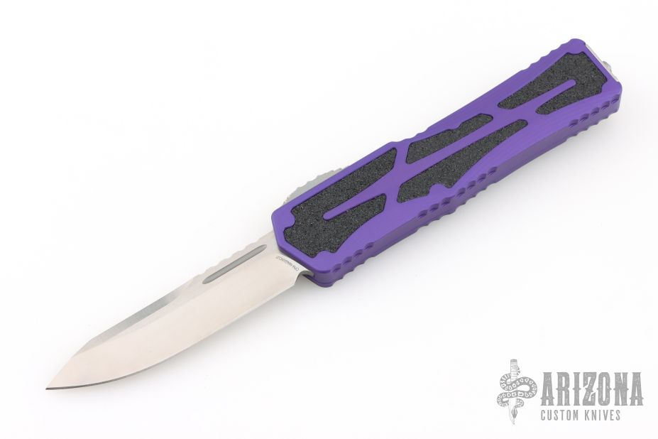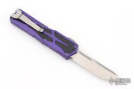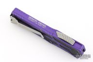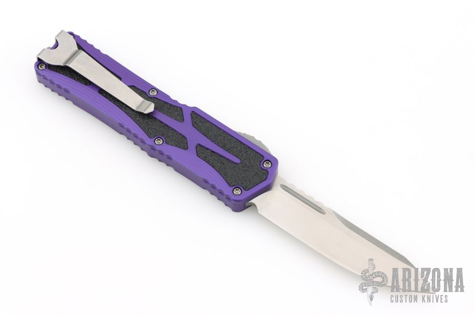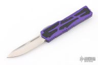 This Colossus by Heretic Knives features a stonewash finish blade with fullers and notched thumbrest. The handle has a purple aluminum frame with non-slip inlays, checkered thumb slide, stainless steel tip down clip. Comes with original box, papers and oil. S/N 01669. Excellent Condition.