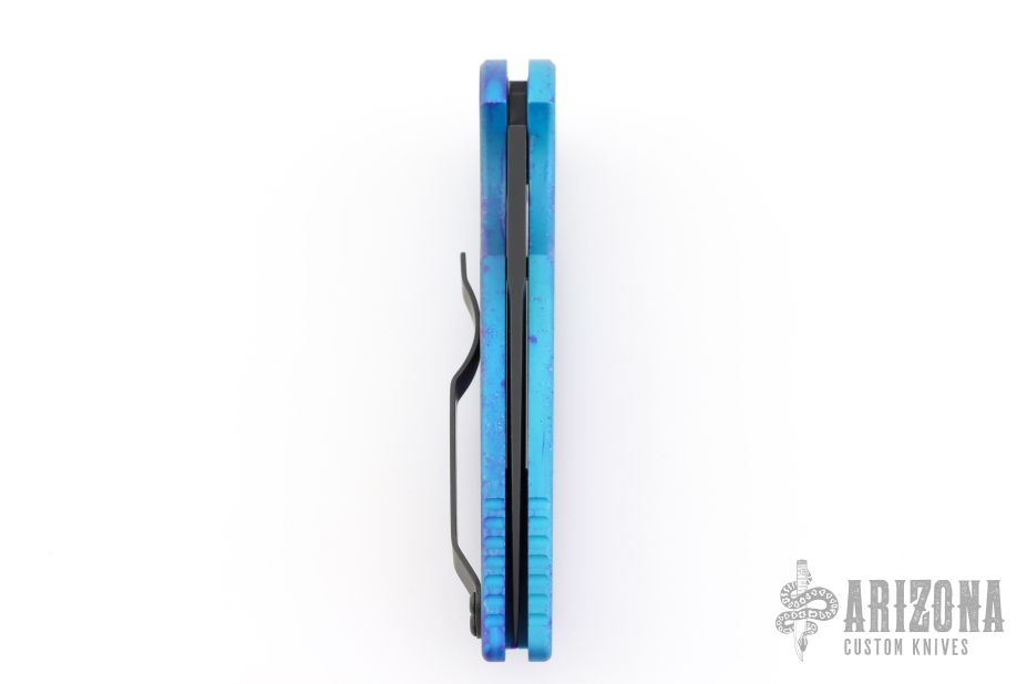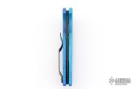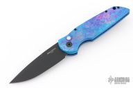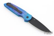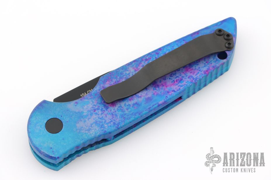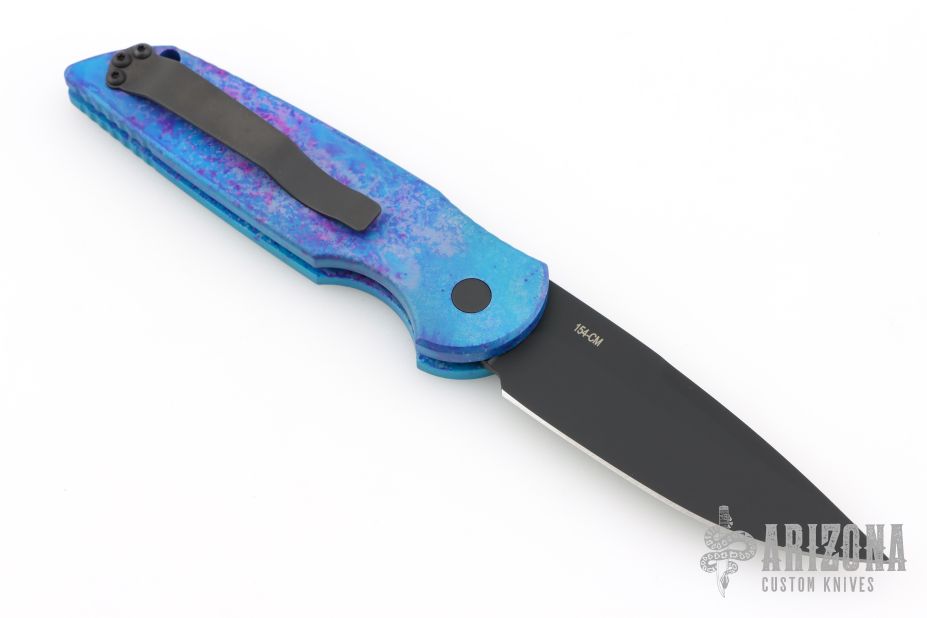 This Pro-Tech TR-3 model features a blue/purple Jazz handle with a mother of pearl push button. It has a black DLC blade and a stainless tip up carry pocket clip. The TR-3 is a responsive automatic knife that won't let you down. It fires hard, locks up like a rock, and feels great in hand. The slim design sits comfortably for tip-up pocket carry. Comes with original box and papers. Excellent condition.