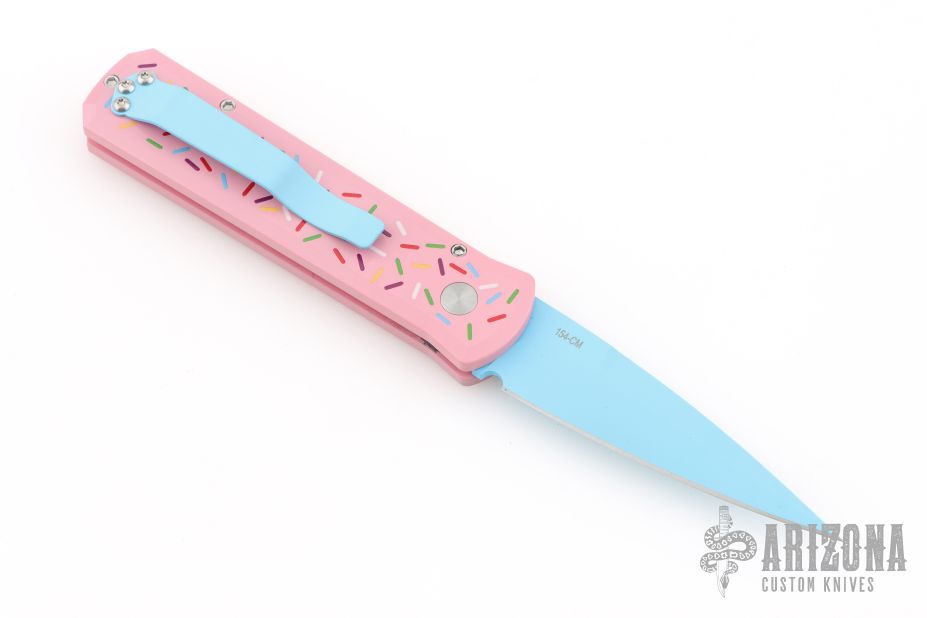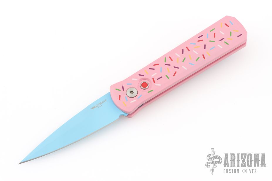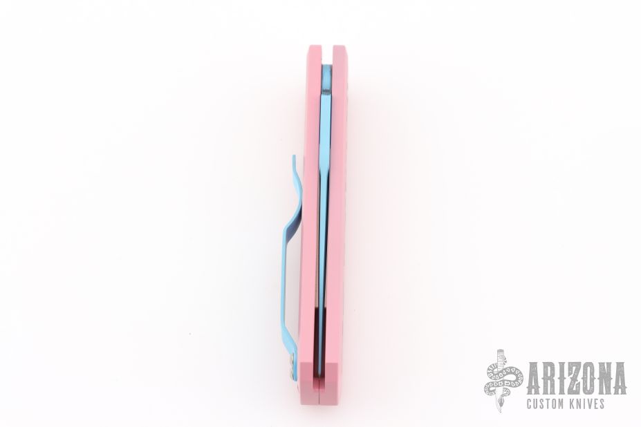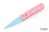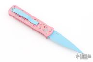 This Godson by Pro-Tech features a blue finished blade with false top edge. The handle has a pink aluminum handle with blue tip up stainless steel clip.  Purple G10 inaid push button. BHQ Exclusive. Comes with original box and papers. Excellent condition.