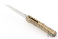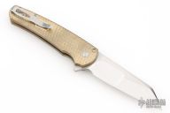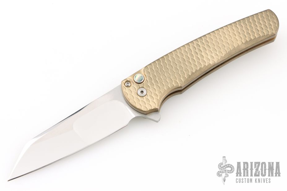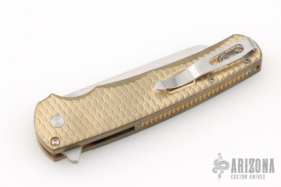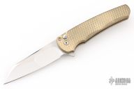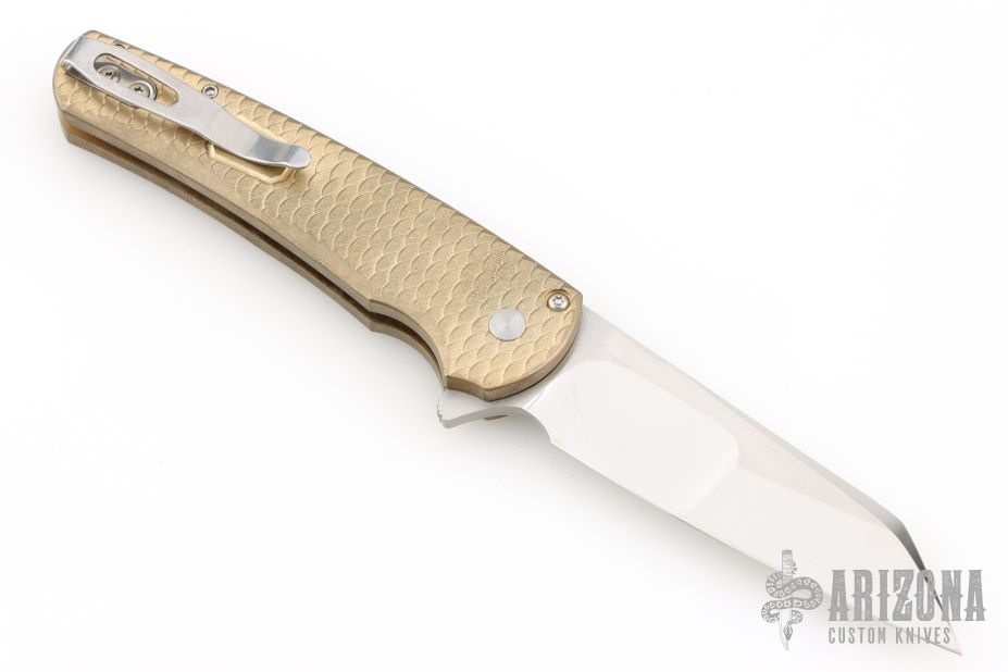 Highlighted by its silky smooth action and featherweight nature, the Malibu is an EDC force to be reckoned with. The reverse tanto blade is especially good at utility tasks with a slight belly and strong useful tip. The ergonomic handle is milled aluminum bronze with a tapered shape and finger grooves that really allow for a solid, non-slip grip. The deep carry clip is set-up for right-hand, tip-up carry and a tiny lanyard hole is built into the single-pieces handle scales/backspacer. It reminds us a bit of a Kershaw Leek and a Benchmade 940...two of the best EDC knives available and we think it'll find a home alongside those powerhouses in no time. This model features a hand-ground mirror blade by Mike Irie and an aluminum bronze textured handle. Comes with original box and papers. Excellent condition.
