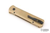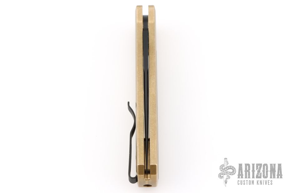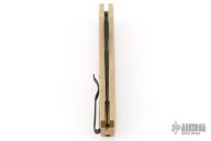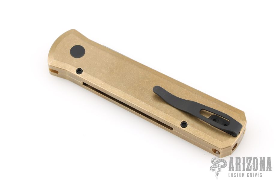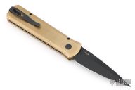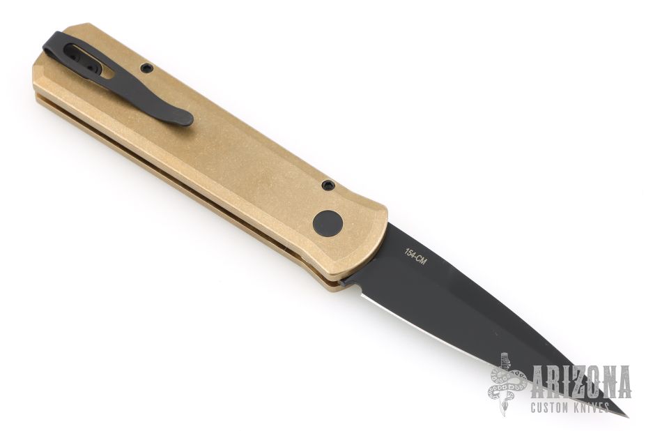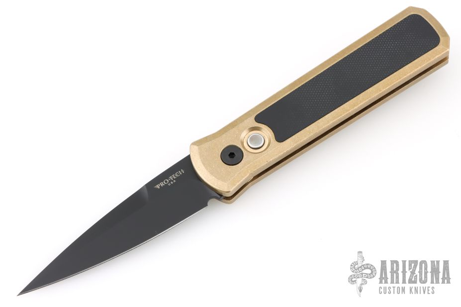 This Godson from Pro-Tech Knives features a black blade with swedge. The handle has a bronzed aluminum frame with a black lip pearl push button, black tip up clip. Black G-10 inlay. Comes with original box and papers. Excellent condition.