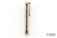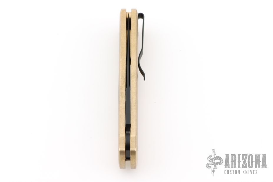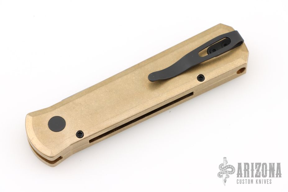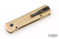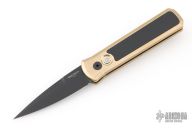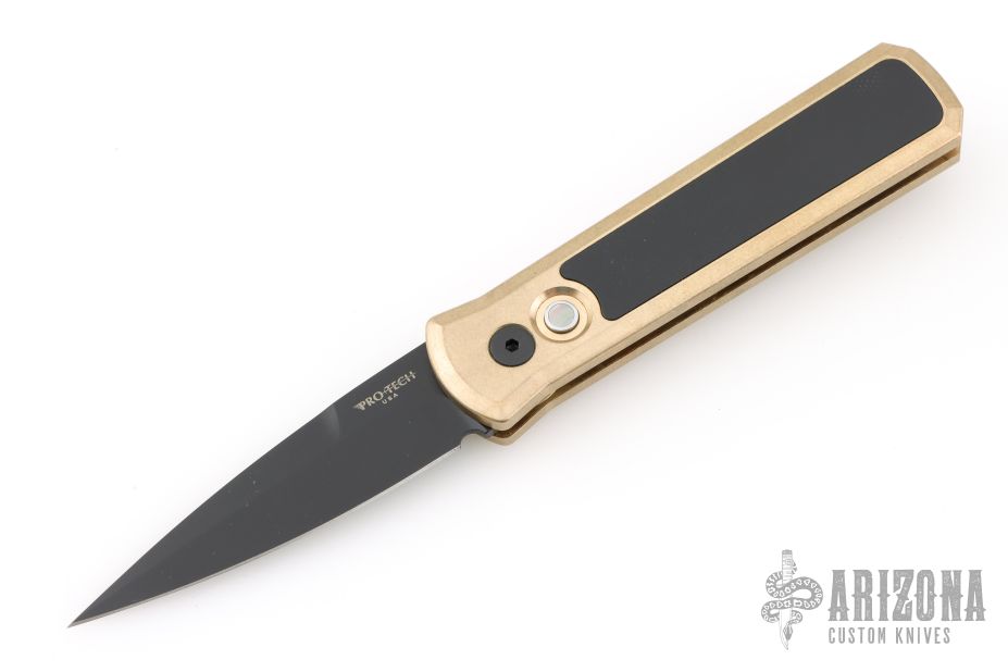This Godson from Pro-Tech Knives features a black blade with swedge. The handle has a bronzed aluminum frame with a black lip pearl push button, black tip up clip. Black G-10 inlay. Comes with original box and papers. Excellent condition.