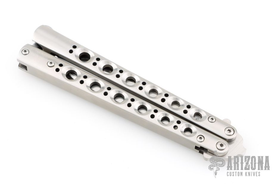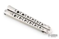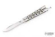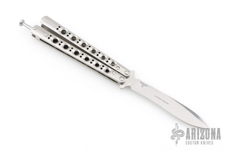 This Model 41SS Balisong from Benchmade features a recurve drop point blade with swedge. The handle has a stainless steel frame with spring T-latch. Comes with original box, papers, and sheath. Excellent condition.