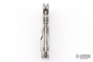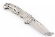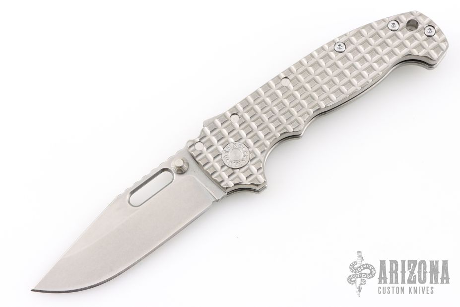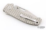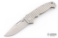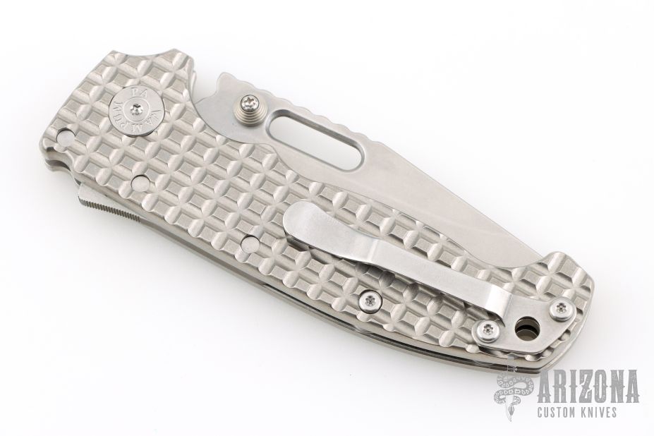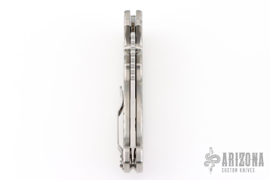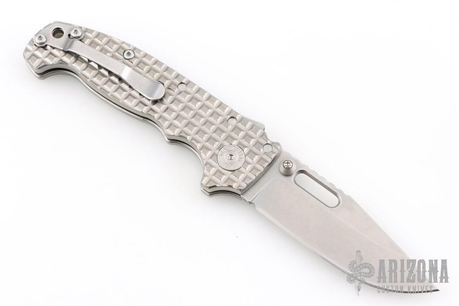 This AD20 by Demko Knives features a stonewashed blade with notched thumbrest, dual thumbstuds and a thumbhole. .130" blade thickness. The handle has a stonewashed frag pattern titanium frame with a tip up stainless steel clip and "Shark" lock release on the spine. Comes with original box. Excellent condition.