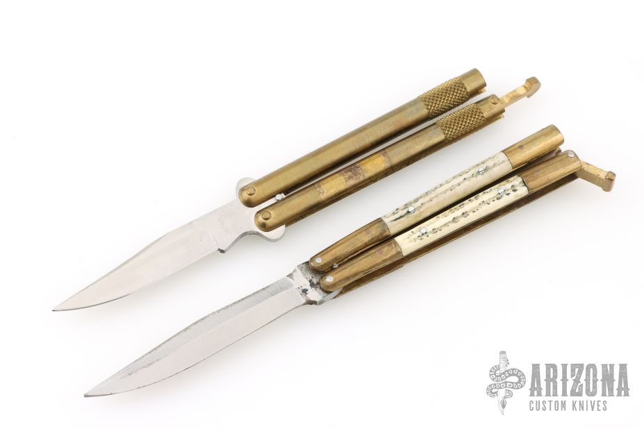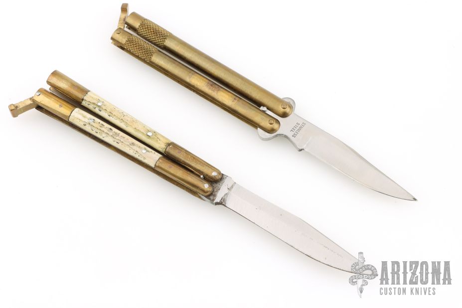 This balisong from the Philippines features a spear point blade with a satin finished blade. The handle has brass bolsters, brass channel construction, jigged bone scales, brass T-latch. Has scratches and patina, otherwise good condition.