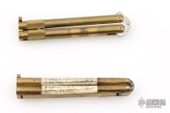 This balisong from Japan features a clip point blade with a satin finished blade. The handle features brass channel construction, checkering, and brass T-latch. Has scratches and patina, otherwise good condition.