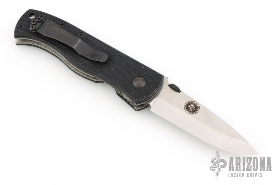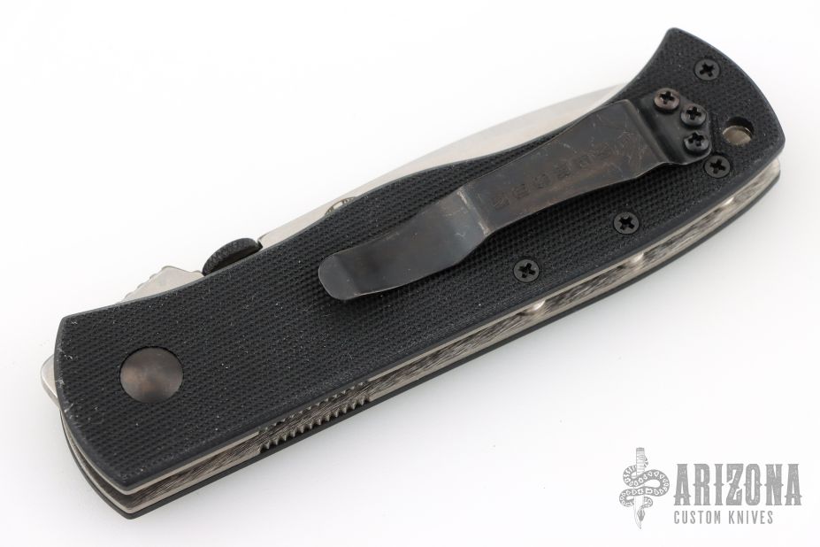 This CQC-7A by Emerson Knives has a stonewashed blade with notched thumbrest and a thumbdisc. The handle has black G-10 scales, titanium liners, black barrel spacers, tip up black stainless steel clip. #2748. Comes with original box and papers. Excellent condition.