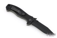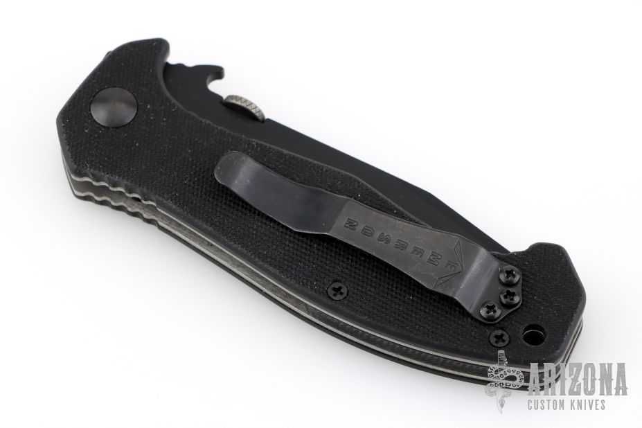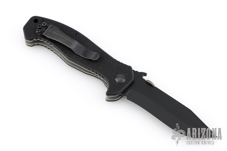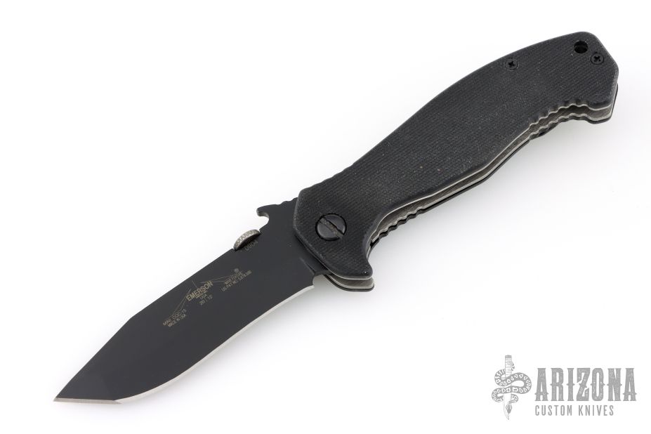 This Area 51 Mini CQC-15 BTS from Emerson features a black recurve tanto blade with notched thumbrest, thumbhole and wave feature. The handle has black G-10 scales, titanium liners, black G-10 backspacer, and a tip up black stainless steel clip. Nice detent, lockup and blade seating. Serial Number 0904. Comes with original box and papers. Excellent condition.