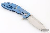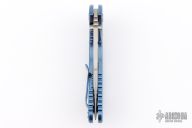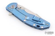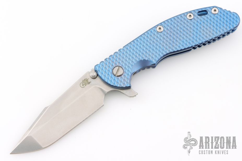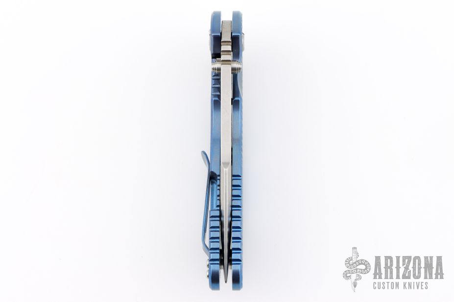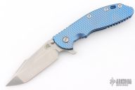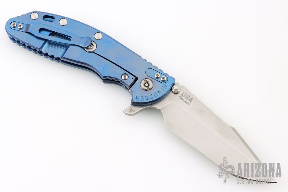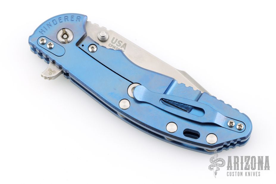This XM-24 by Rick Hinderer features a tumble finished clip point blade with swedge, dual thumb studs, notched thumb rest and flipper. The handle is comprised of a milled anodized titanium scale over titanium liner on the "A" side and a tumbled titanium lock side over titanium barrel spacers. The tumbled titanium pocket clip is reversible for tip up/down, right hand carry. Includes original box, papers, and extra washers. Listing includes original OD Green scale, and Blue G10 Scale, and anodized blue liner. Excellent condition.