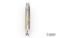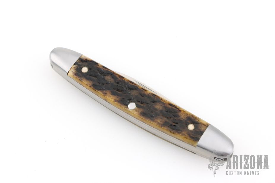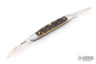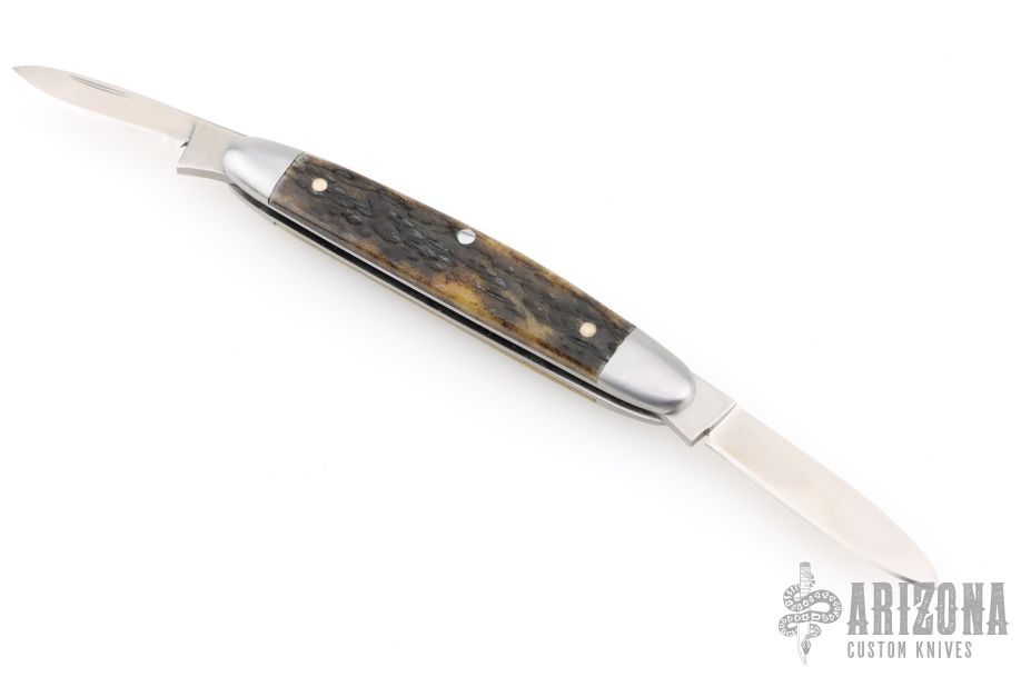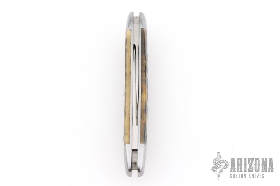 This slipjoint by Bill Simons features satin finished blades with nail nicks. The handle has stainless steel bolsters, jigg bone covers, stainless steel liners and spring. #444 inside the spring. Comes with a zippered case. Excellent condition.