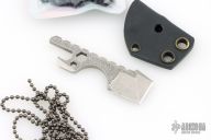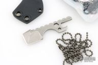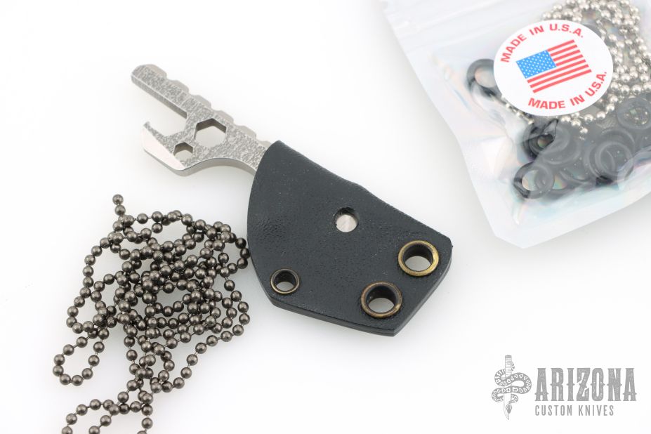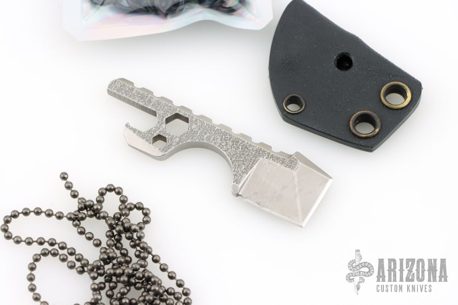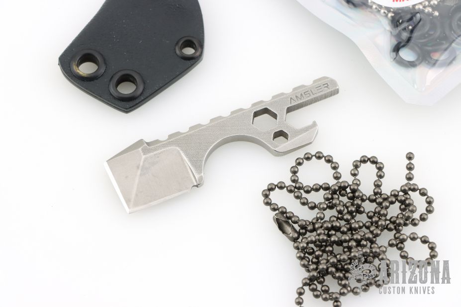 This Bottle Defense Tool by Amsler Knives features a stonewashed hand ground blade with notched thumbrest, bottle opener, 1/4" hex wrench and 5/32" hex wrench. Bos Heat Treated. Comes with sheath, chain, o-rings, and bit. Has scratches, great condition otherwise.
