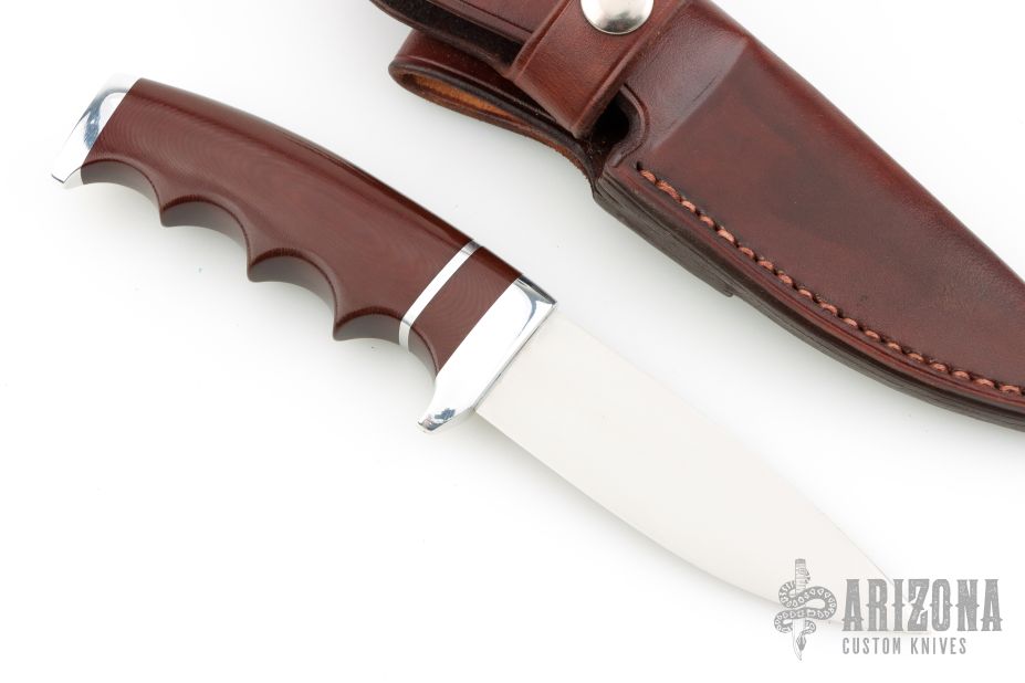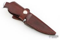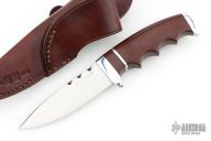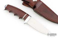 This Finger Grip Hunter by Walter Stockdale features a hand rub satin finished drop point blade with convex edge and fileworked spine, .114" blade stock and 1.143" blade depth, hidden tang construction. The handle has an aluminum guard and butt, maroon linen micarta grip with an aluminum spacer. Includes leather sheath with belt loop. Excellent condition.