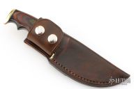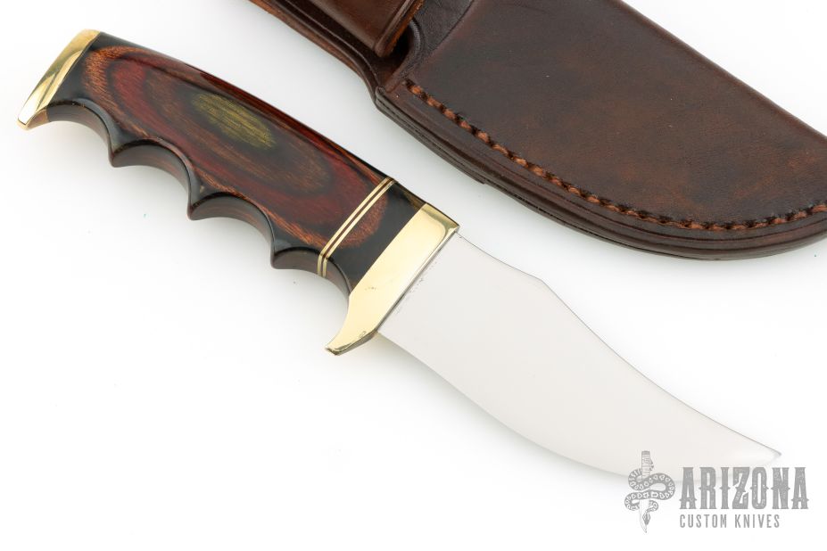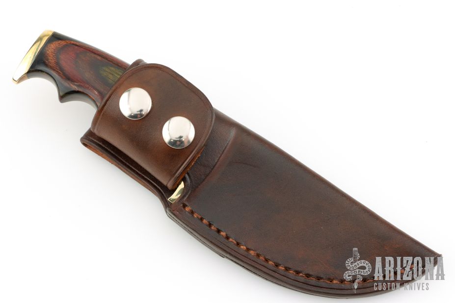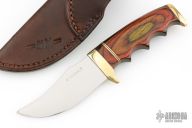 This Finger Grip Hunter by Walter Stockdale features a hand rub satin finished blade with convex edge, .124" blade stock and 1.395" blade depth, hidden tang construction. The handle has a brass guard and butt, laminated wood grip with brass/black spacers. Includes leather sheath with belt loop. Excellent condition.