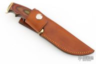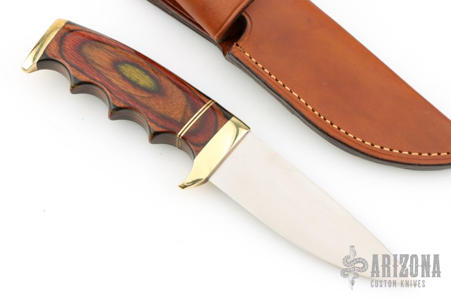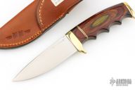 This Finger Grip Hunter by Walter Stockdale features a hand rub satin finished drop point blade with convex edge, .124" blade stock and 1.222" blade depth, hidden tang construction. The handle has a brass guard and butt, laminated wood grip with brass/black spacers. Includes leather sheath with belt loop. Excellent condition.