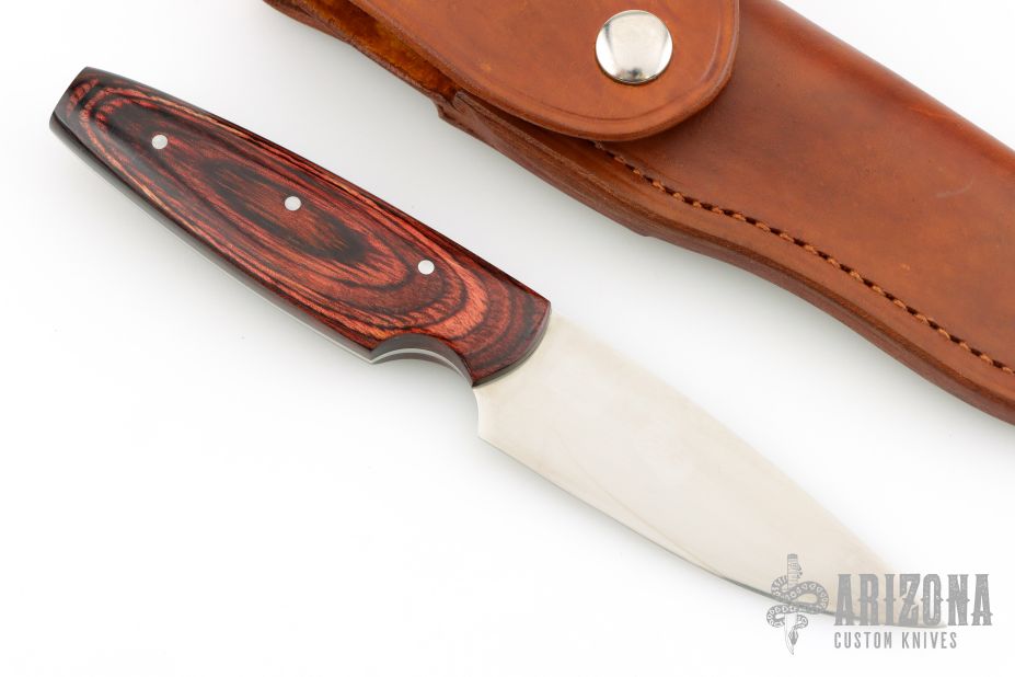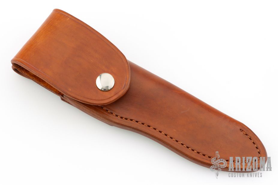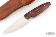 This Utility Hunter by Walter Stockdale features a hand rub satin finished drop point blade with convex edge, .092" blade stock and 1.202" blade depth, full tang construction. The handle has laminated wood scales. Includes leather sheath with belt loop. Excellent condition.