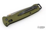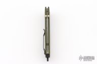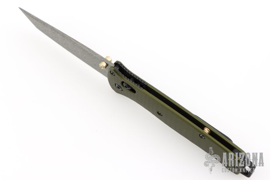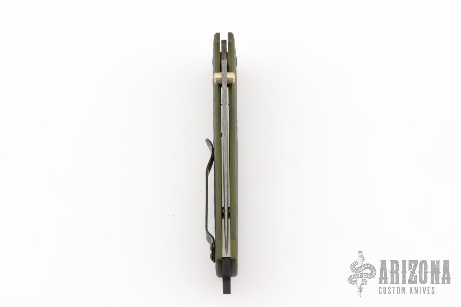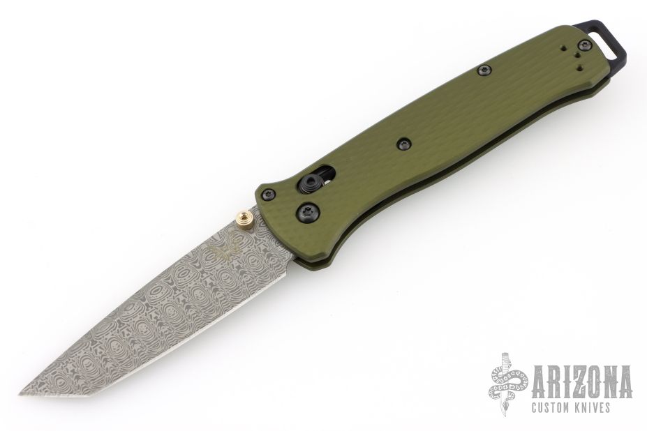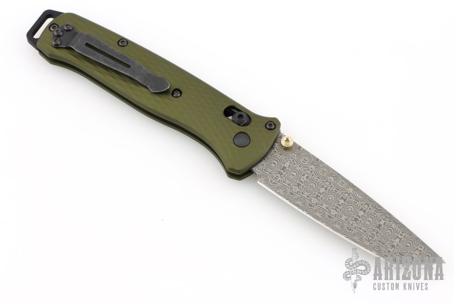 This Benchmade Custom Bailout features a Damascus tanto style blade with swedge, and dual anodized thumb studs. The handle features a diamond-checker mill patterned, green anodized aluminum, with black hardware, single gold anodized standoff, and black backspacer with exposed lanyard bail. There is a black tip up clip. Comes with original box. There are light scratches on the clip. Excellent condition.