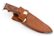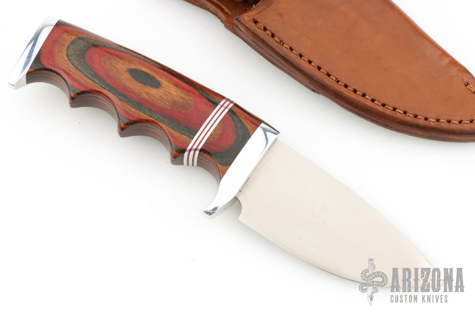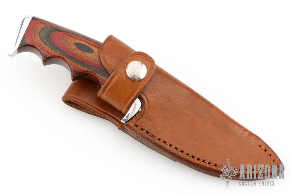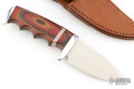 This Finger Grip Hunter by Walter Stockdale features a hand rub satin finished drop point blade with convex edge with fileworked spine, .131" blade stock and 1.502" blade depth, hidden tang construction. The handle has an aluminum guard and butt, laminated wood grip with aluminum/red spacers. Includes leather sheath with belt loop. Excellent condition.