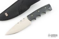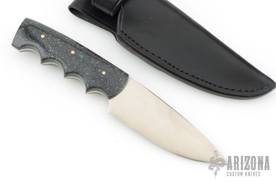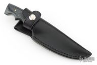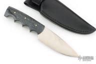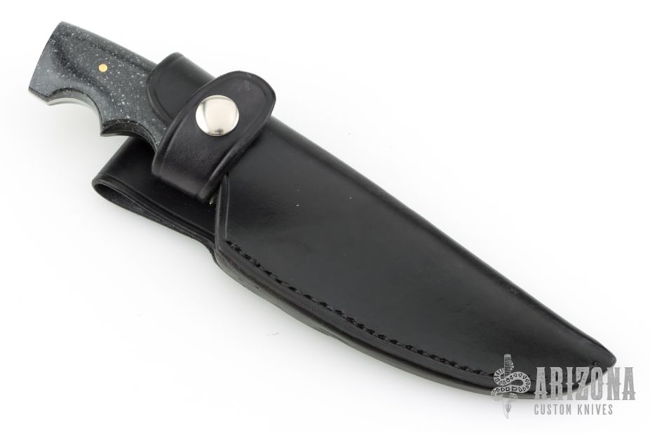 This Utility Hunter by Walter Stockdale features a hand rub satin finished drop point blade with convex edge and fileworked spine, .133" blade stock and 1.467" blade depth, full tang construction. The handle has corian scales. Includes leather sheath with belt loop. Excellent condition.