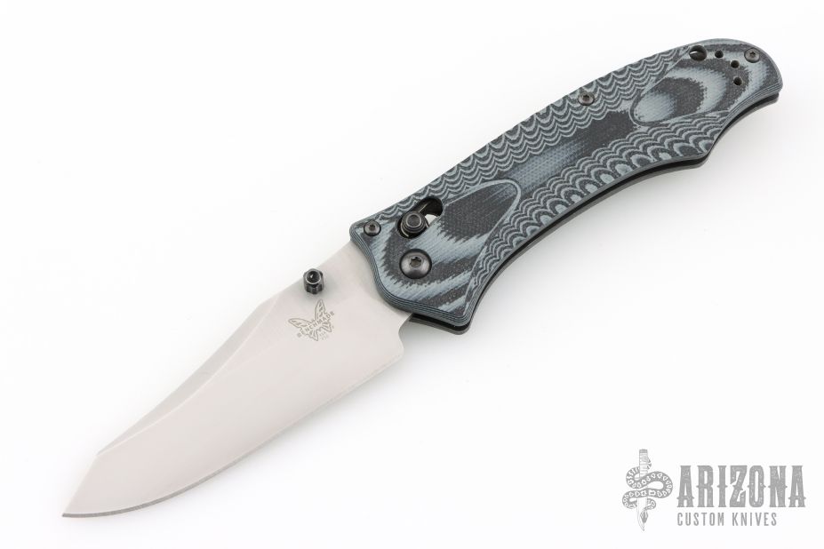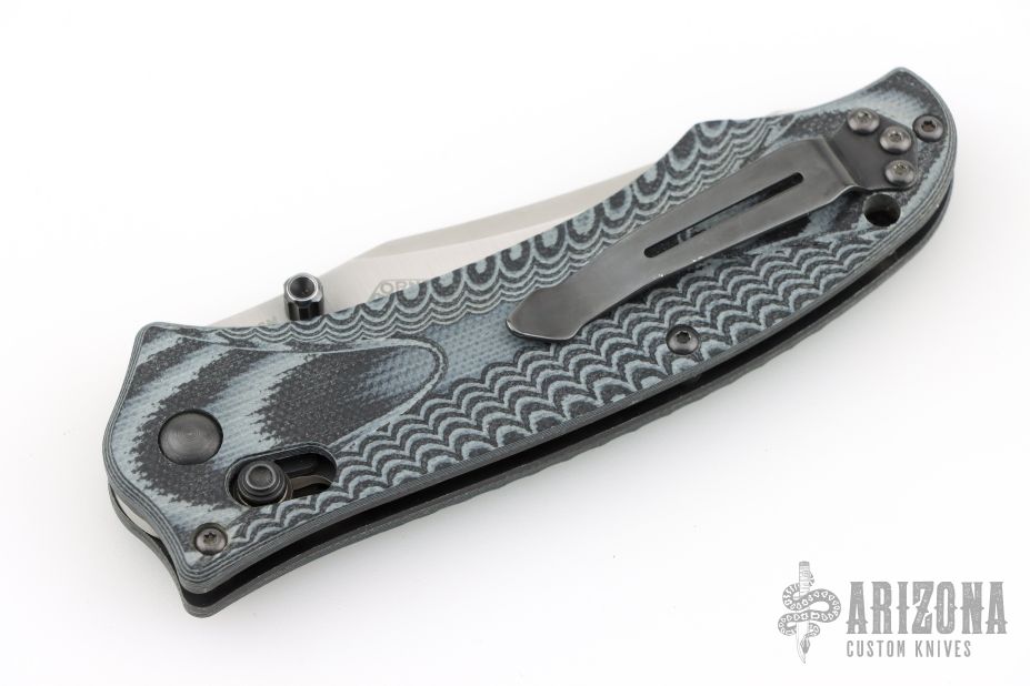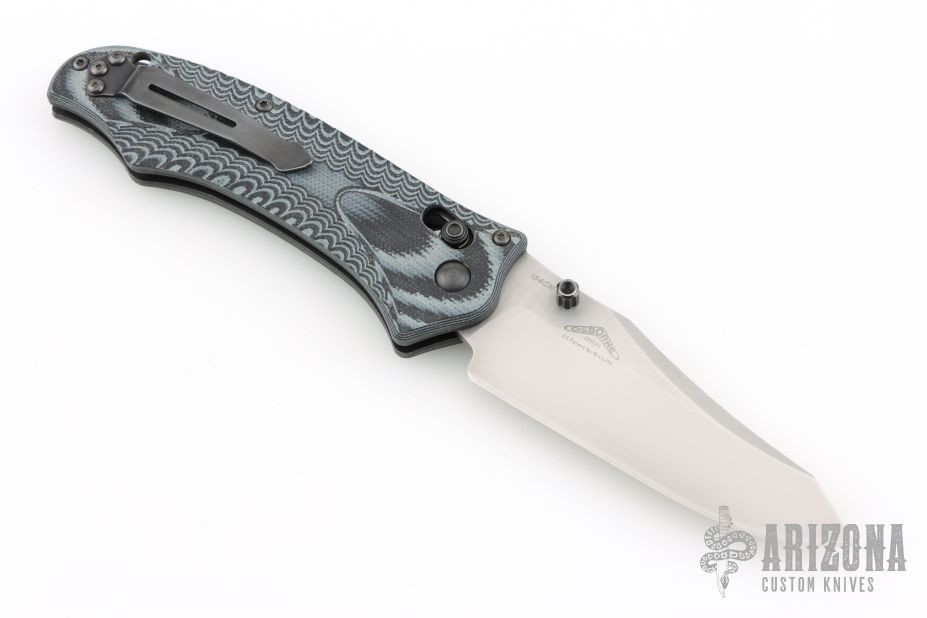 This 950 Axis Lock Rift from Benchmade features a clip point matte finish blade with swedge and dual thumb studs. The handle is comprised of machined black/white G-10 with black coated stainless steel liners and reversible tip up pocket clip. Has a couple marks on the clip. Excellent condition. Comes with original box and papers.