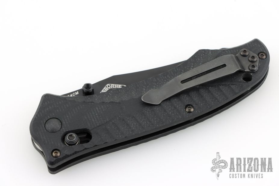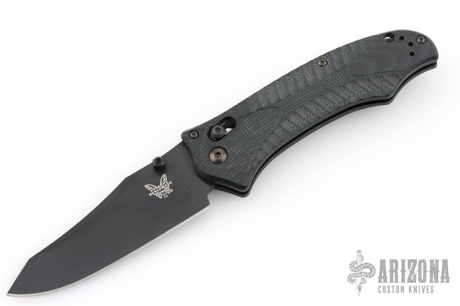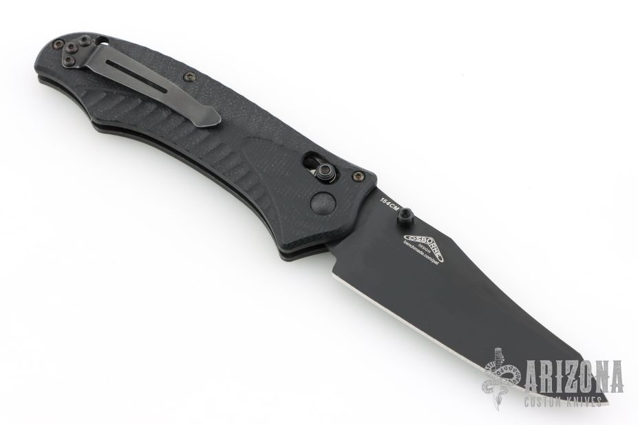 This Osborne designed Rift from Benchmade features a black coated clip point 154CM blade and sculpted black G-10 scales, black stainless steel liners and tip up reversible clip. Includes original box, pouch, and papers. Excellent condition.
