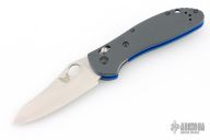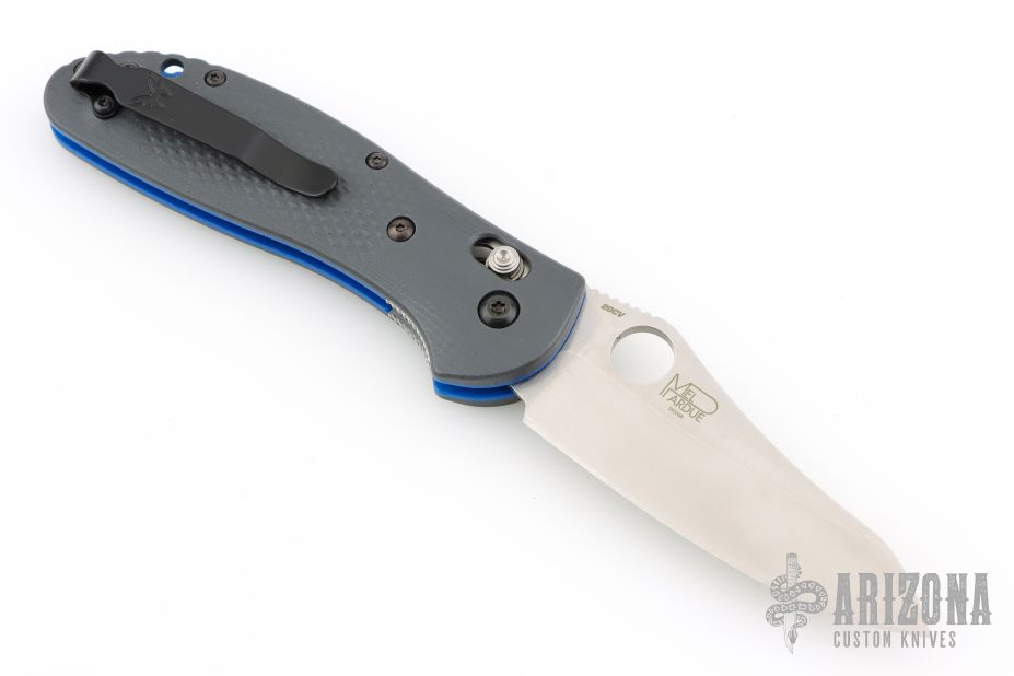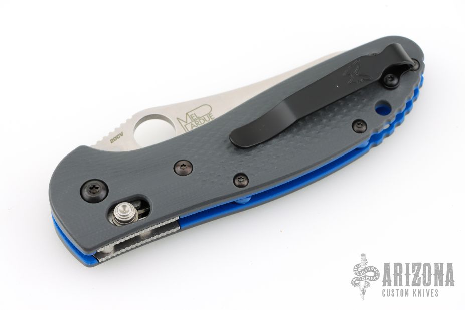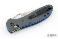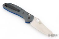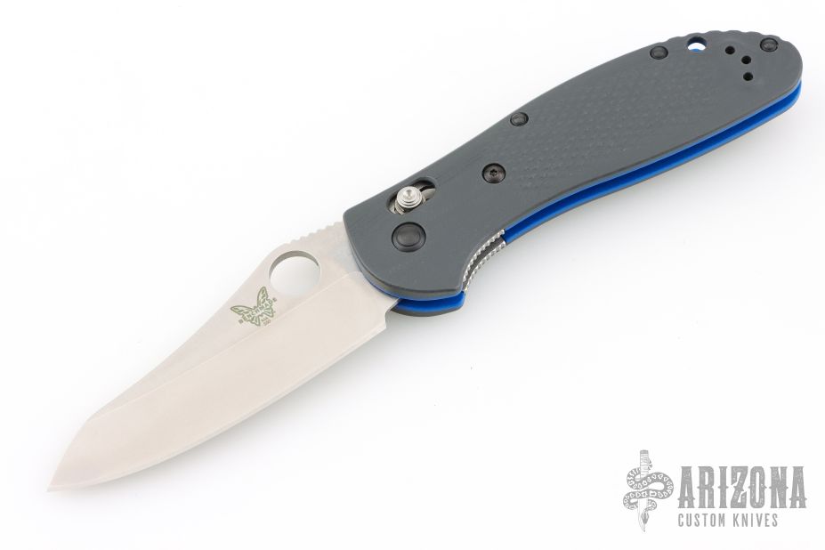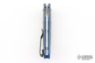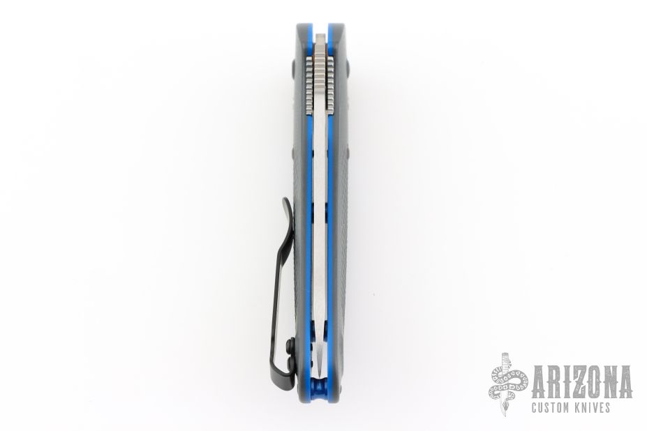 This Griptilian 550-1 by Benchmade features a stonewashed blade with swedge, notched thumbrest and dual thumbstuds. The handle has textured grey G-10 scales with blue G-10 liners, blue anodized barrel spacers. The pocket clip can be reversed for right or left tip up carry. The AXIS lock system makes the knife easy to open and easy to close. Comes with the wrong BM box (551-1), draw-string pouch and papers. Has some scuffs on the clip. Excellent condition.