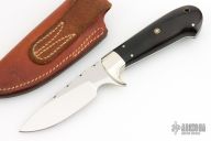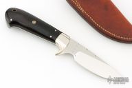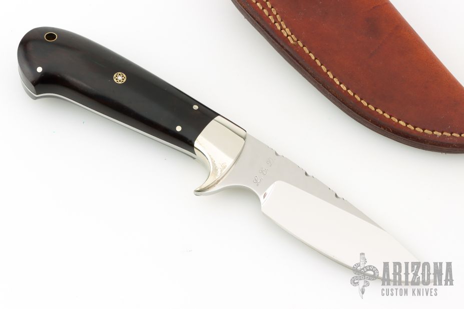 This knife by Larry E Dougherty features a mirror finished blade with fileworked blade spine, .131" blade stock and 1.106" blade depth, full tapered tang construction. The handle has dovetailed nickel silver bolsters, black walnut scales with nickel silver and mosaic pins and a lanyard hole. Excellent condition. Comes with a brown leather sheath.