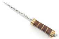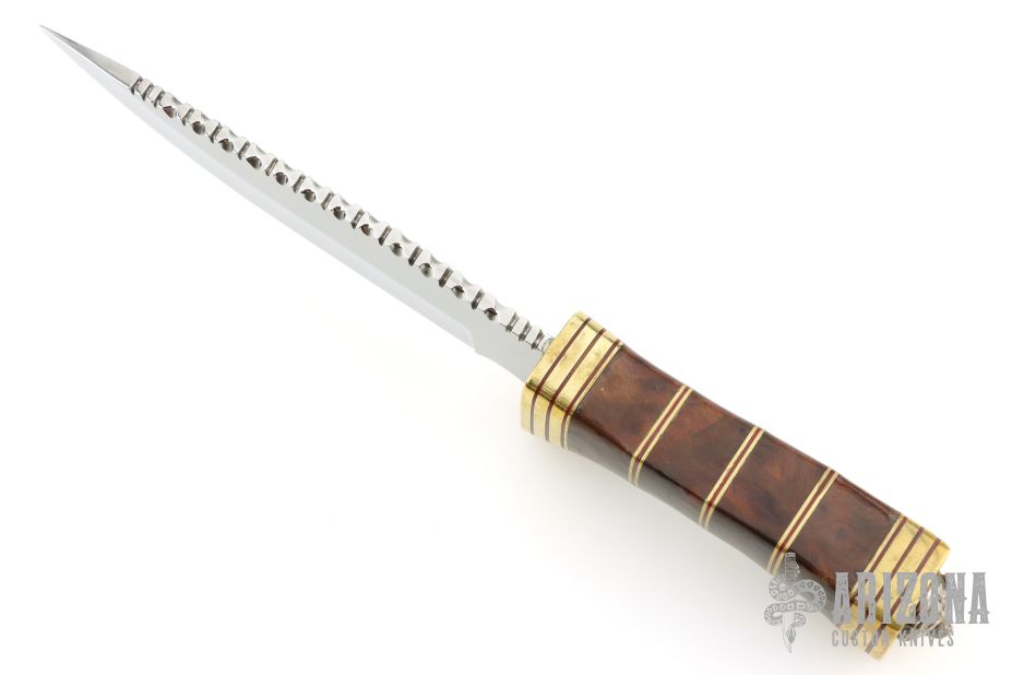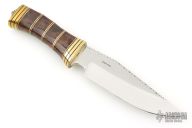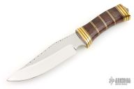 This knife by Roy Farris features a mirror polished blade with fileworked spine, .188" blade stock and 1.497" blade depth, hidden tang construction. The handle has a brass guard and butt with stacked burl wood grip with red/brass spacers. The butt has a silver bear head on the butt with ruby stone eyes. Comes with a zippered case. Has a couple light scratches, otherwise excellent condition.