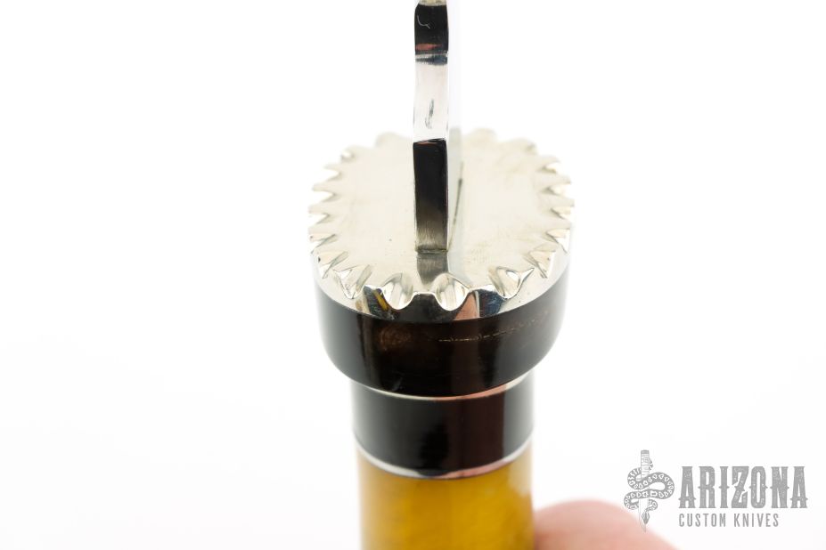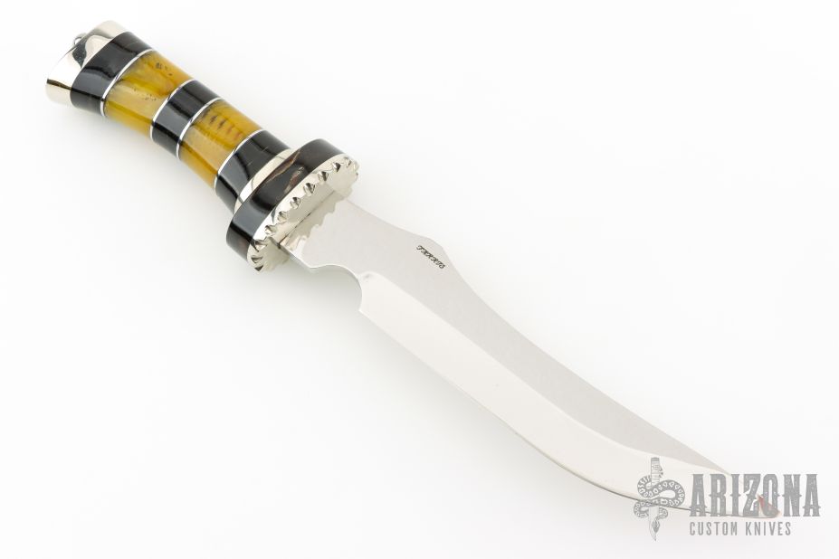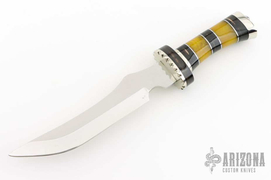 This knife by Roy Farris features a mirror polished blade with .188" blade stock and 1.523" blade depth, hidden tang construction. The handle has a fileworked nickel silver guard and butt, stacked amber and buffalo horn grip with nickel silver spacers. Comes with a zippered case. Has a couple light scratches, otherwise excellent condition.