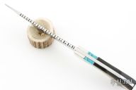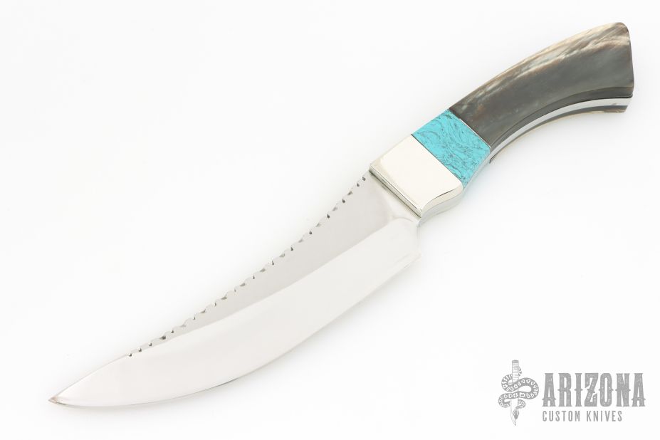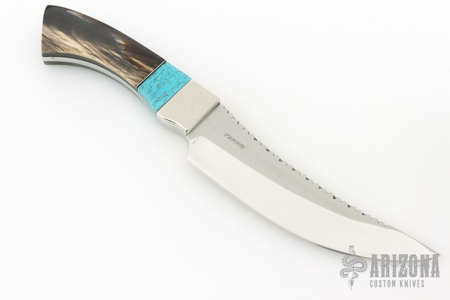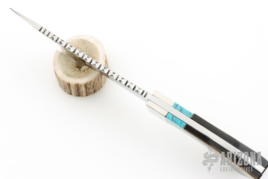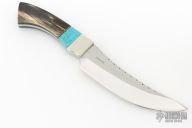 This knife by Roy Farris features a mirror polished blade with fileworked spine, .196" blade stock and 1.423" blade depth, full tang construction. The handle has nickel silver bolsters, buffalo horn scales with nickel silver and turquoise spacers. Comes with a zippered case. Has a couple light scratches, otherwise excellent condition.