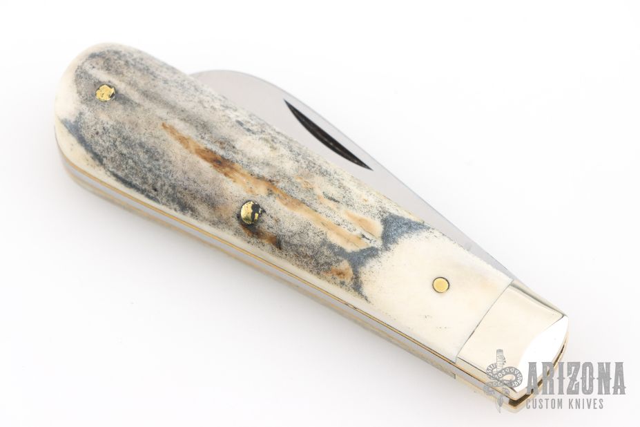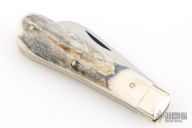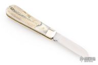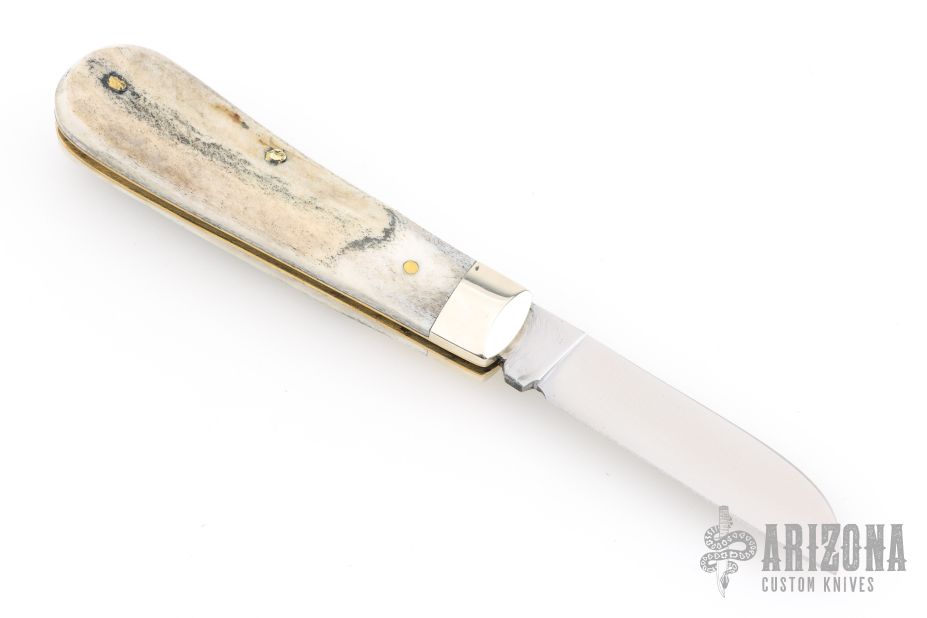 This slipjoint by A. Wright & Sons Sheffield England features a satin finished sheepsfoot blade. The handle features nickel silver bolsters with niceley contoured bone covers, brass liners and steel spring. Has a couple light scuffs, excellent condition.