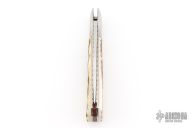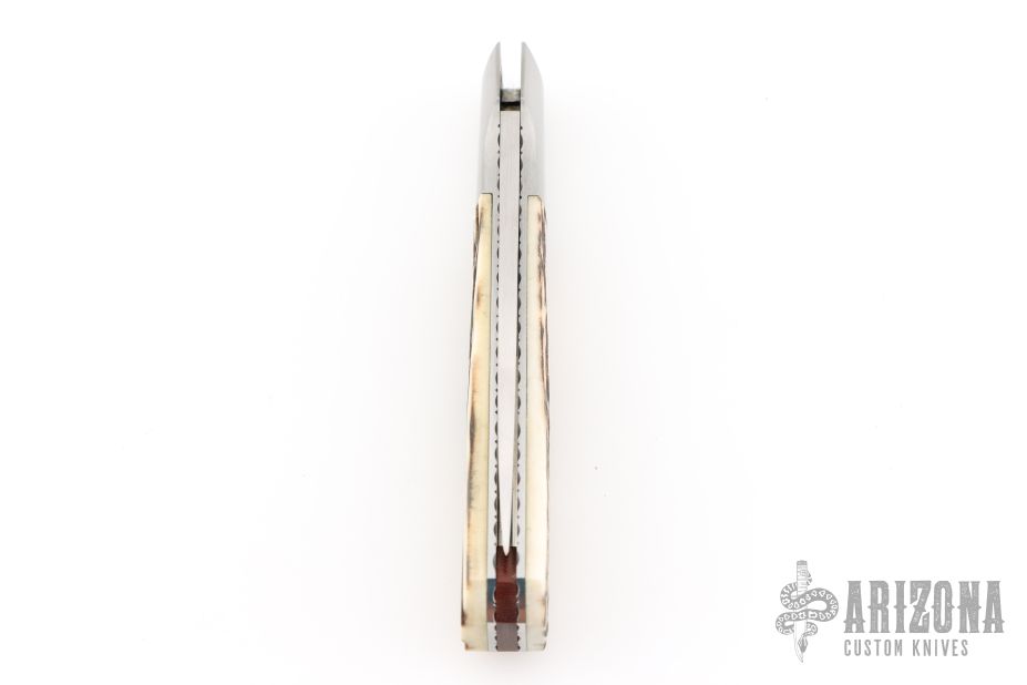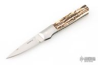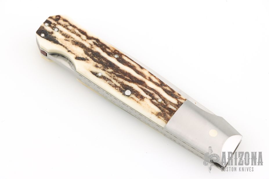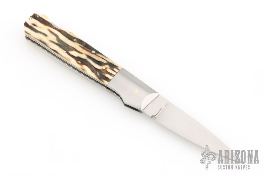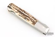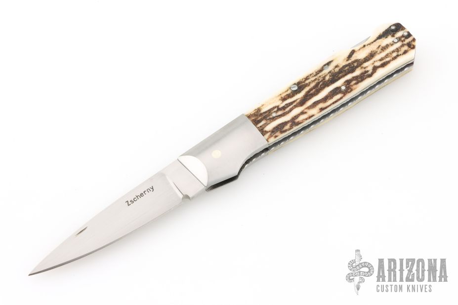 This Lockback from Mr. Zscherny features a hand rub satin finished blade with nail nick. The handle has satin finished stainless steel bolsters, stag covers, integral stainless steel liners with nice file work and rockerbar. Nice lockup and blade seating. Comes in a zipper case. Has a couple light scuffs and scratches on the bolster, excellent condition otherwise.