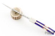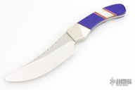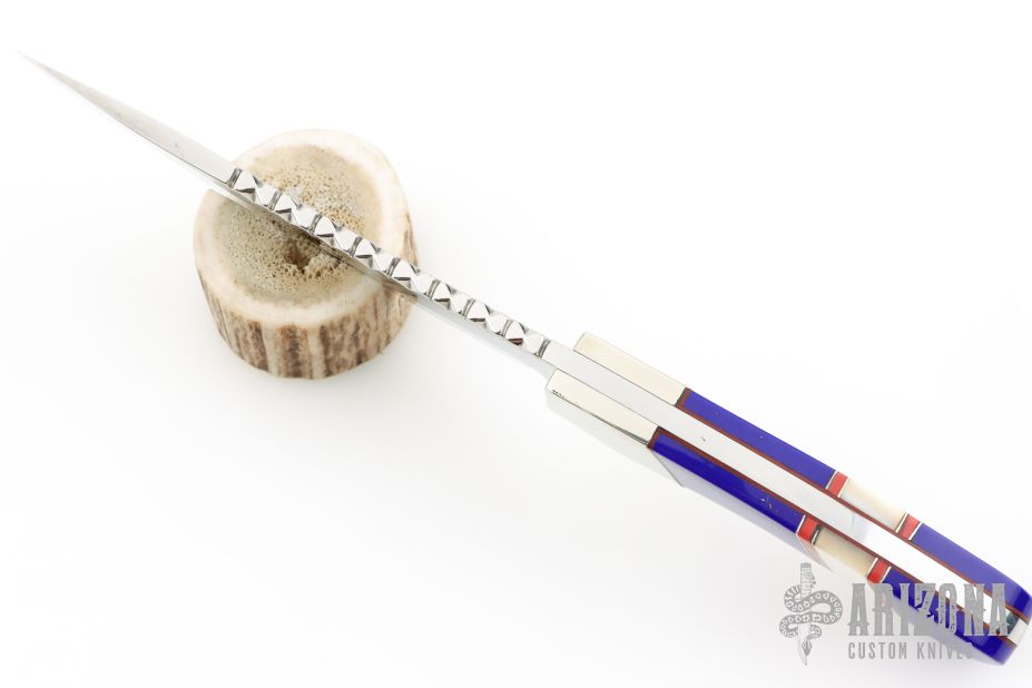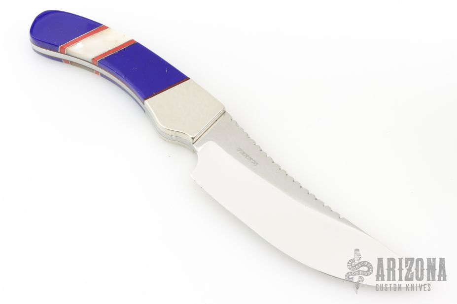 This knife by Roy Farris features a mirror polished blade with fileworked spine, .187" blade stock and 1.400" blade depth, full tang construction. The handle has a nickel silver bolsters, multi-piece corian and mother of pearl scales with nickel silver/red spacers. Comes with a zippered case. Has a couple light scratches, otherwise excellent condition.