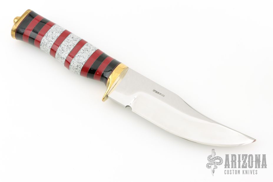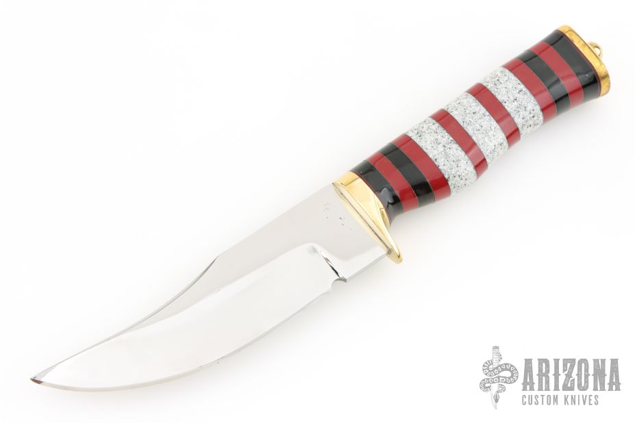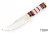 This knife by Roy Farris features a mirror polished blade with false top edge, .193" blade stock and 1.511" blade depth, hidden tang construction. The handle has a brass guard and butt with stacked corian grip with red/black spacers. Comes with a zippered case. Has a couple light scratches, otherwise excellent condition.