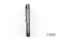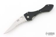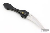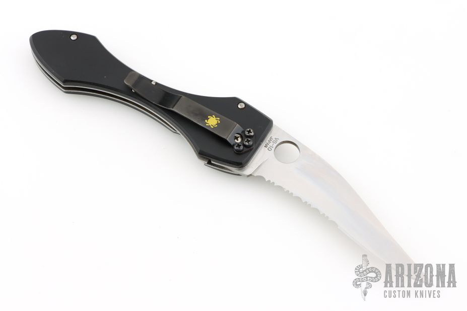 This Shabaria by Spyderco features a satin finished recurve partially serrated blade with thumbhole. The handle has black linen micarta scales, stainless liners, and a black stainless tip down clip. Has a couple light scuffs, otherwise excellent condition.