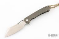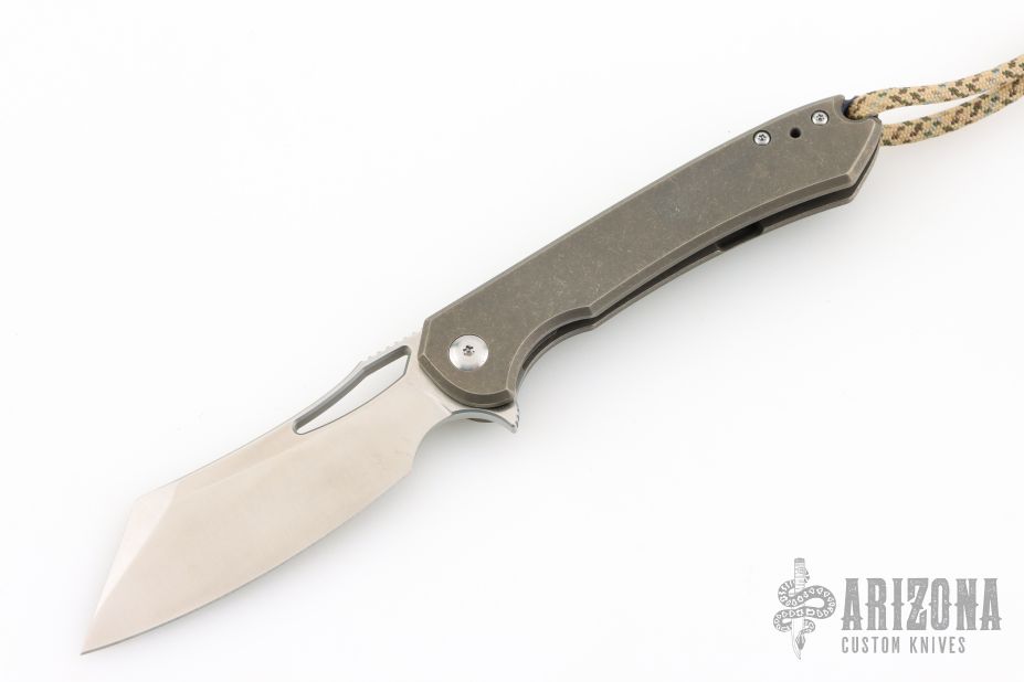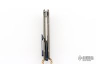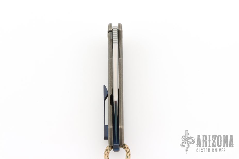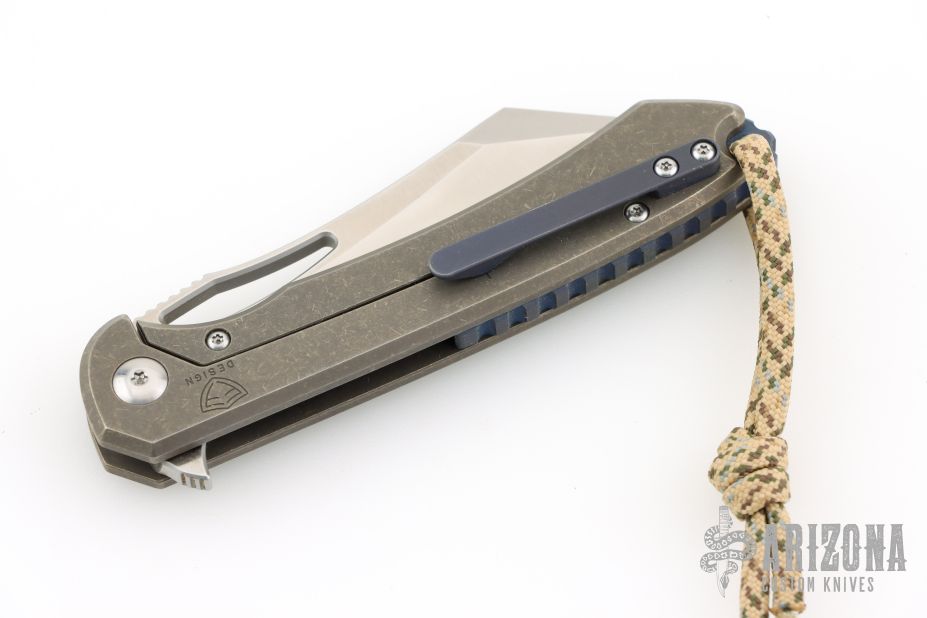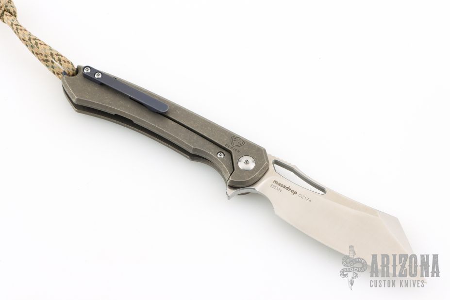 This Buccaneer by Massdrop is a Ferrum Forge design, it features a satin finished blade with thumbhole, notched thumbrest and flipper. The handle has an anodized and tumbled titanium frame, anodized titanium backspacer and reversible tip up clip, has a stainless lockface insert. Nice detent, lockup and blade seating. Has a couple light scratches on the clip, excellent condition otherwise.